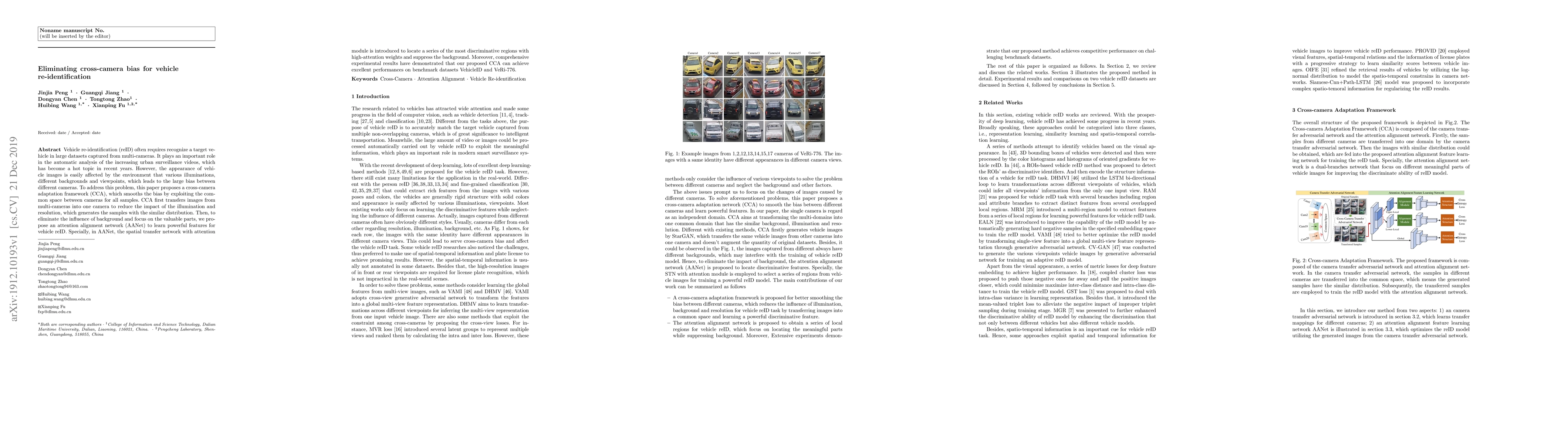 This paper proposes a cross-camera adaptation framework (CCA) to reduce bias in vehicle re-identification across multi-camera datasets. CCA transfers images to a common space and uses an attention alignment network (AANet) to focus on discriminative regions, achieving superior performance on benchmark datasets.