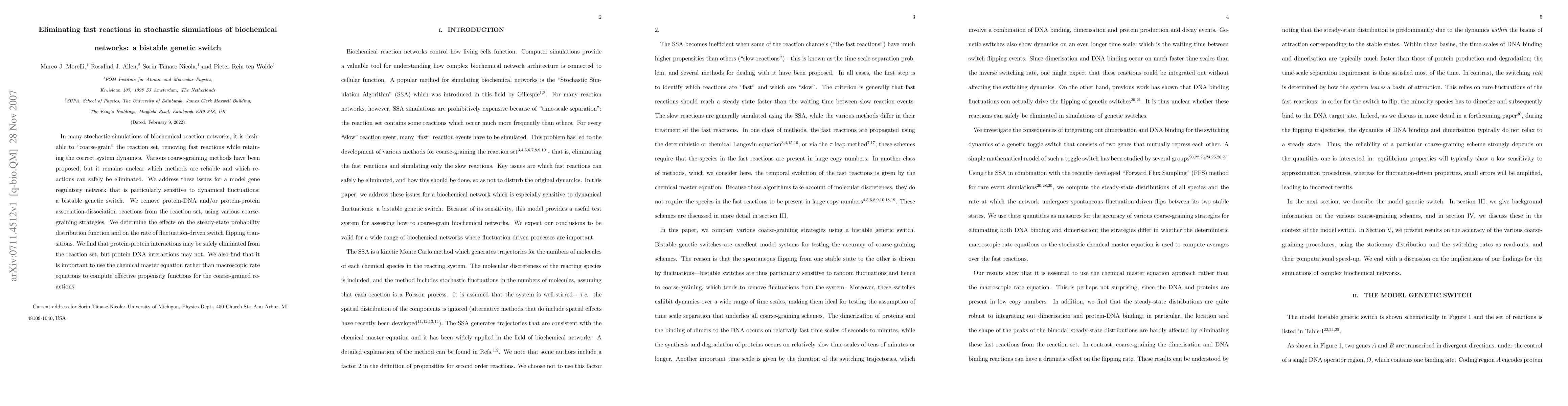 This paper investigates the removal of fast reactions in stochastic simulations of biochemical networks, focusing on a bistable genetic switch. The study finds that protein-protein interactions can be safely eliminated without affecting system dynamics, but protein-DNA interactions are crucial and should not be removed. It emphasizes the importance of using the chemical master equation for accurate coarse-graining.