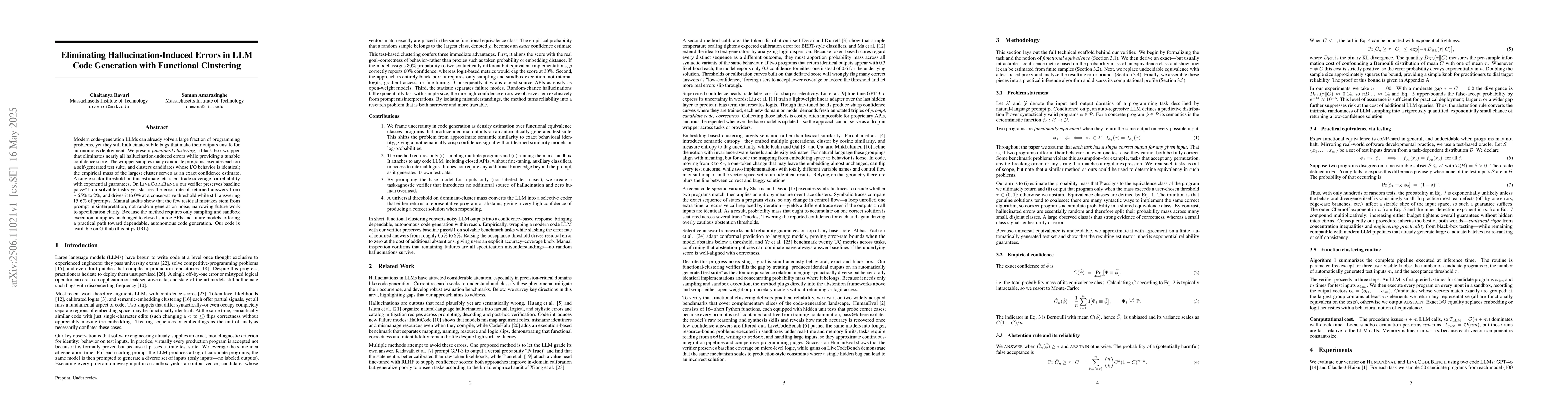 Modern code-generation LLMs can already solve a large fraction of programming problems, yet they still hallucinate subtle bugs that make their outputs unsafe for autonomous deployment. We present functional clustering, a black-box wrapper that eliminates nearly all hallucination-induced errors while providing a tunable confidence score. The wrapper samples many candidate programs, executes each on a self-generated test suite, and clusters candidates whose I/O behavior is identical; the empirical mass of the largest cluster serves as an exact confidence estimate. A single scalar threshold on this estimate lets users trade coverage for reliability with exponential guarantees. On LiveCodeBench our verifier preserves baseline pass@1 on solvable tasks yet slashes the error rate of returned answers from ~65% to 2%, and drives it to 0% at a conservative threshold while still answering 15.6% of prompts. Manual audits show that the few residual mistakes stem from prompt misinterpretation, not random generation noise, narrowing future work to specification clarity. Because the method requires only sampling and sandbox execution, it applies unchanged to closed-source APIs and future models, offering a practical path toward dependable, autonomous code generation. Our code is available on Github (https://github.com/20ChaituR/functional-clustering).