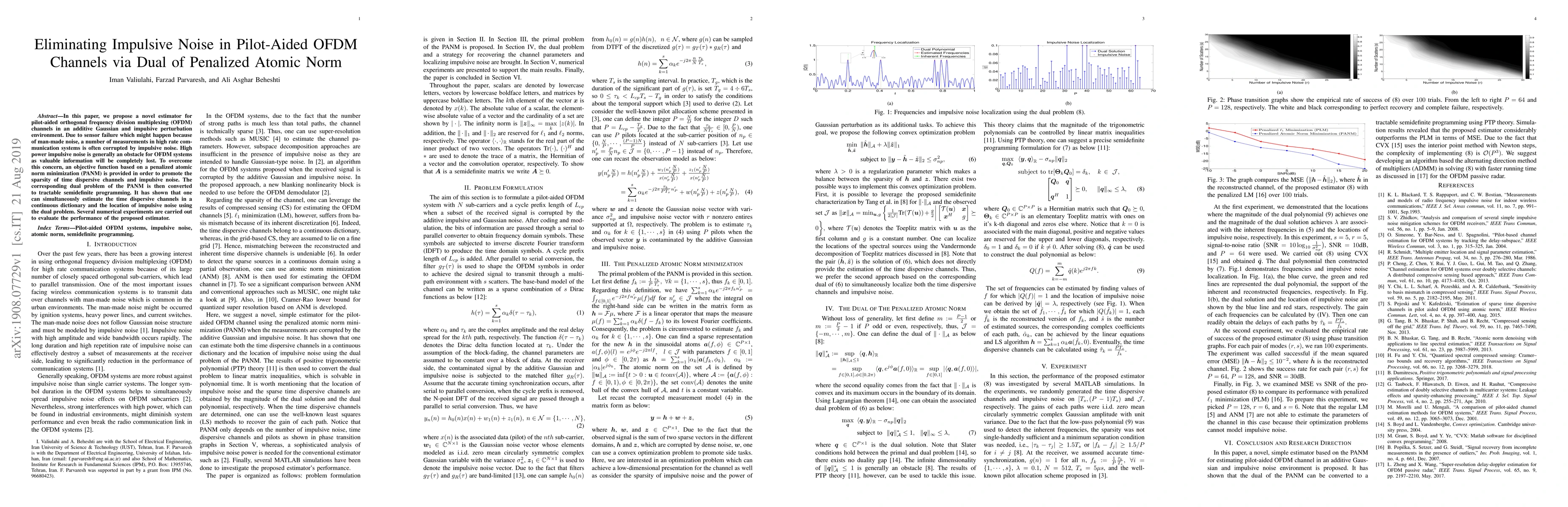 This paper proposes a novel estimator for pilot-aided OFDM channels that uses penalized atomic norm minimization to handle impulsive noise. The dual problem of this minimization is converted to semidefinite programming, enabling simultaneous estimation of time-dispersive channels and impulsive noise locations.