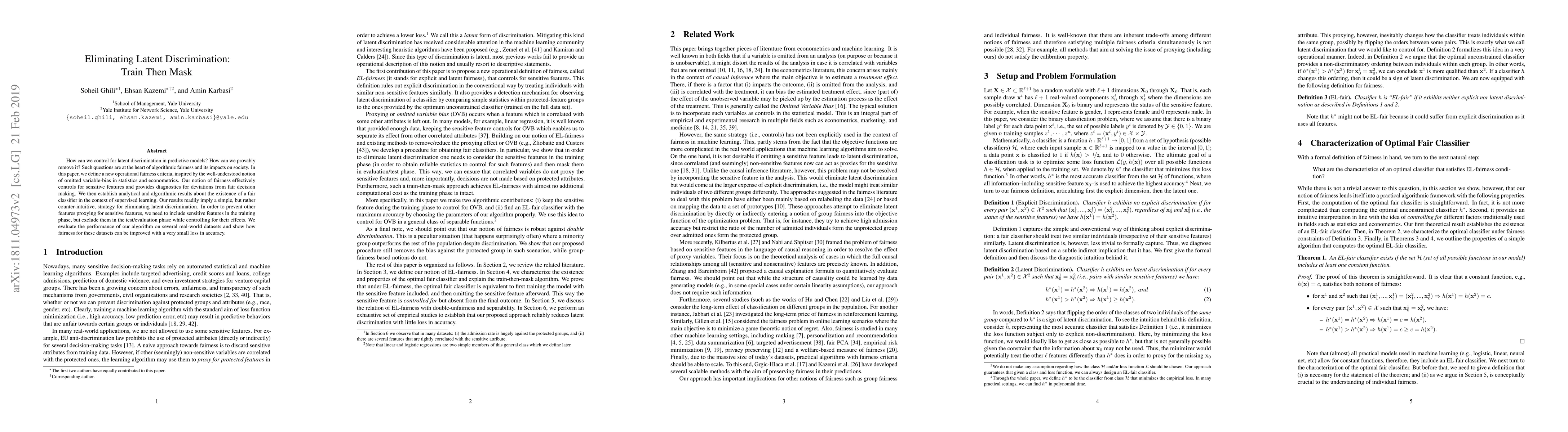How can we control for latent discrimination in predictive models? How can we provably remove it? Such questions are at the heart of algorithmic fairness and its impacts on society. In this paper, we define a new operational fairness criteria, inspired by the well-understood notion of omitted variable-bias in statistics and econometrics. Our notion of fairness effectively controls for sensitive features and provides diagnostics for deviations from fair decision making. We then establish analytical and algorithmic results about the existence of a fair classifier in the context of supervised learning. Our results readily imply a simple, but rather counter-intuitive, strategy for eliminating latent discrimination. In order to prevent other features proxying for sensitive features, we need to include sensitive features in the training phase, but exclude them in the test/evaluation phase while controlling for their effects. We evaluate the performance of our algorithm on several real-world datasets and show how fairness for these datasets can be improved with a very small loss in accuracy.
