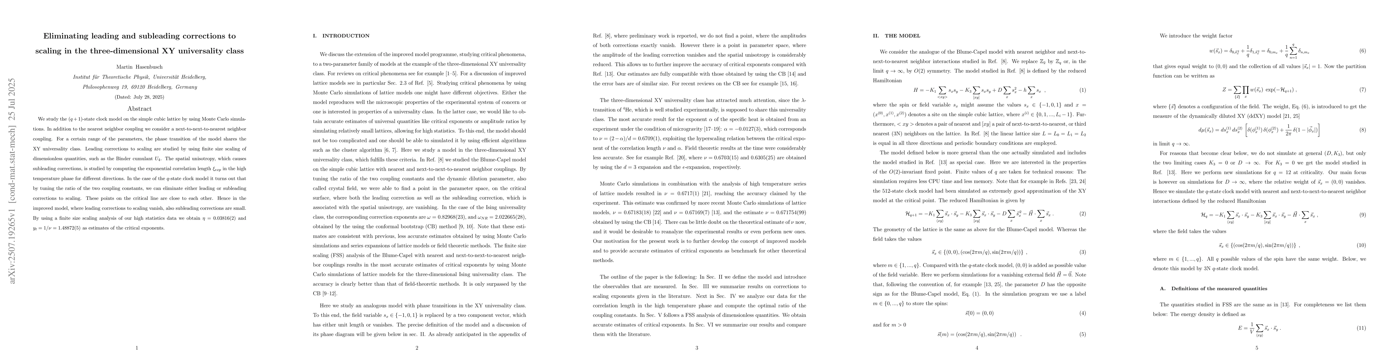 We study the $(q+1)$-state clock model on the simple cubic lattice by using Monte Carlo simulations. In addition to the nearest neighbor coupling we consider a next-to-next-to-nearest neighbor coupling. For a certain range of the parameters, the phase transition of the model shares the XY universality class. Leading corrections to scaling are studied by using finite size scaling of dimensionless quantities, such as the Binder cumulant $U_4$. The spatial unisotropy, which causes subleading corrections, is studied by computing the exponential correlation length $\xi_{exp}$ in the high temperature phase for different directions. In the case of the $q$-state clock model it turns out that by tuning the ratio of the two coupling constants, we can eliminate either leading or subleading corrections to scaling. These points on the critical line are close to each other. Hence in the improved model, where leading corrections to scaling vanish, also subleading corrections are small. By using a finite size scaling analysis of our high statistics data we obtain $\eta=0.03816(2)$ and $y_t =1/\nu=1.48872(5)$ as estimates of the critical exponents.