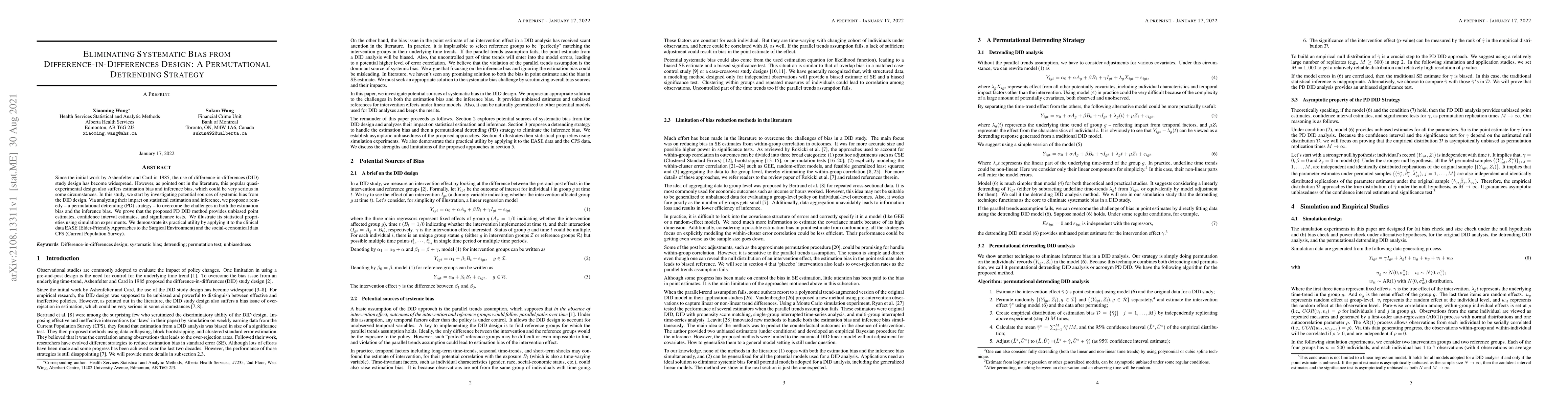 Since the initial work by Ashenfelter and Card in 1985, the use of difference-in-differences (DID) study design has become widespread. However, as pointed out in the literature, this popular quasi-experimental design also suffers estimation bias and inference bias, which could be very serious in some circumstances. In this study, we start by investigating potential sources of systemic bias from the DID design. Via analyzing their impact on statistical estimation and inference, we propose a remedy -- a permutational detrending (PD) strategy -- to overcome the challenges in both the estimation bias and the inference bias. We prove that the proposed PD DID method provides unbiased point estimates, confidence interval estimates, and significance tests. We illustrate its statistical proprieties using simulation experiments. We demonstrate its practical utility by applying it to the clinical data EASE (Elder-Friendly Approaches to the Surgical Environment) and the social-economical data CPS (Current Population Survey). We discuss the strengths and limitations of the proposed approach.