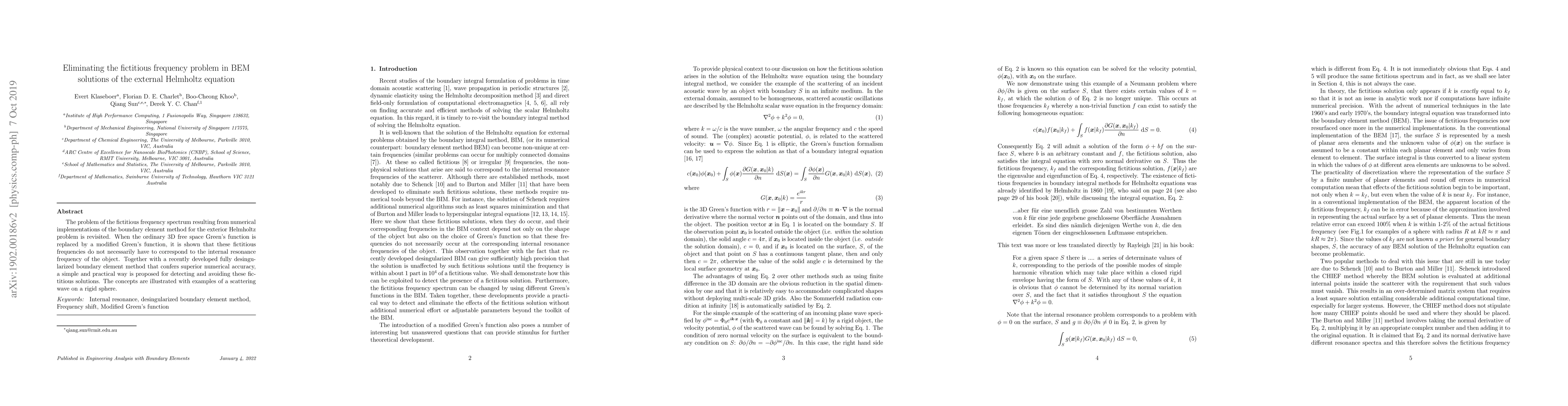 This paper addresses the issue of fictitious frequency errors in boundary element method (BEM) solutions for the exterior Helmholtz equation, proposing a modified Green's function and a desingularized BEM approach to detect and eliminate these errors, demonstrated through scattering simulations on a rigid sphere.