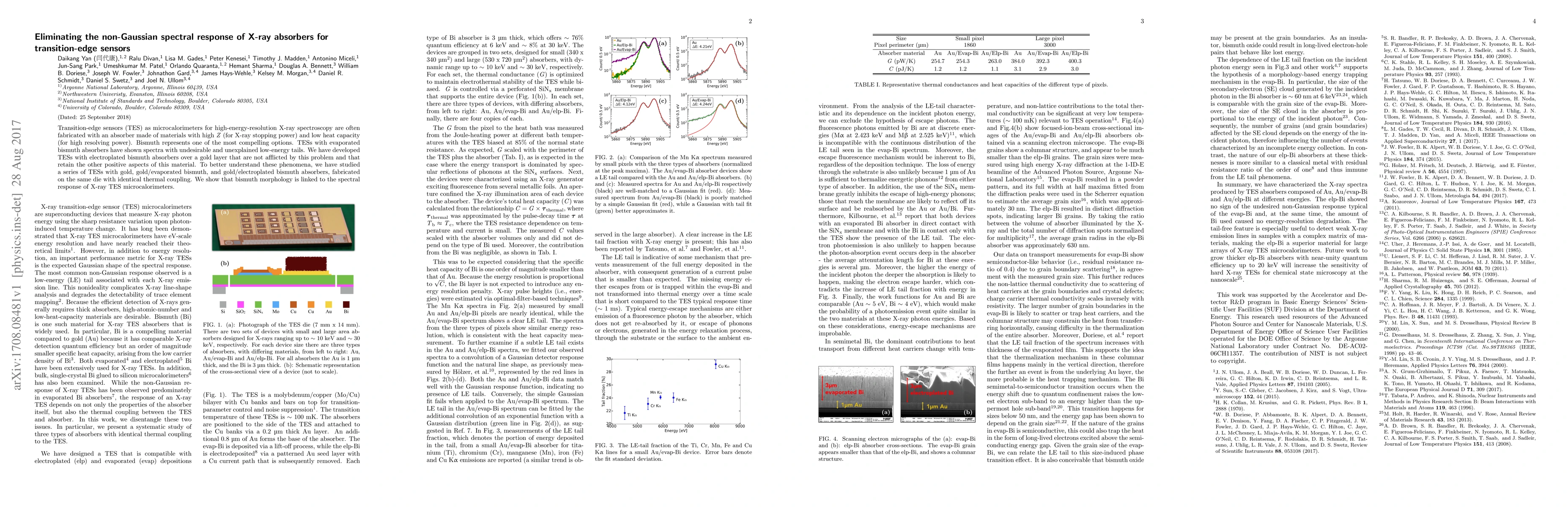 This paper investigates the spectral response of transition-edge sensors (TES) with different bismuth absorbers, finding that electroplated bismuth over a gold layer eliminates undesirable low-energy tails compared to evaporated bismuth. The study reveals that bismuth morphology significantly influences the spectral response of TES microcalorimeters.