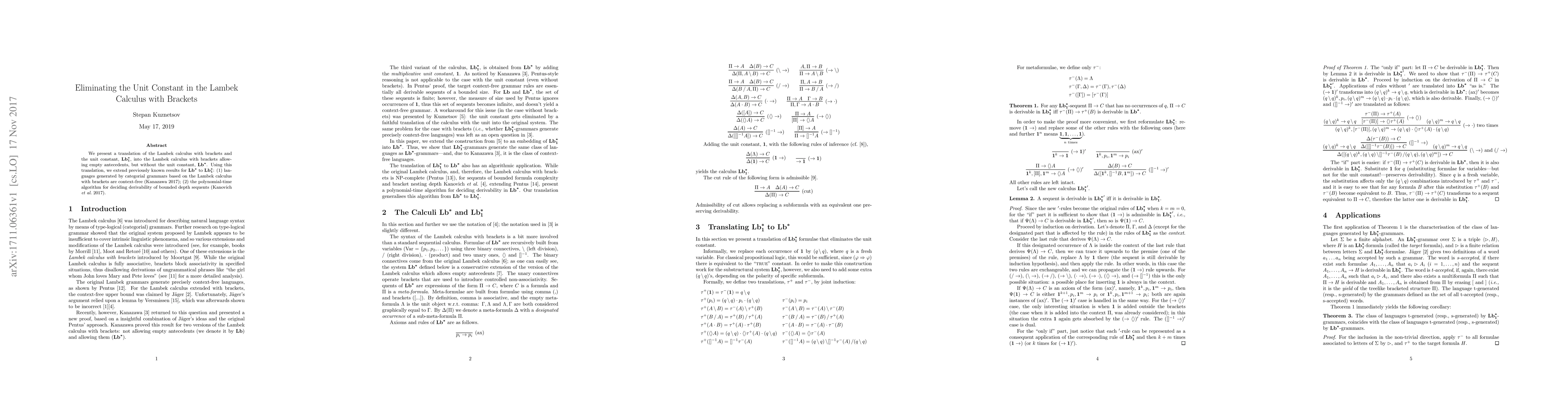 We present a translation of the Lambek calculus with brackets and the unit constant, $\mathbf{Lb}^{\boldsymbol{*}}_{\mathbf{1}}$, into the Lambek calculus with brackets allowing empty antecedents, but without the unit constant, $\mathbf{Lb}^{\boldsymbol{*}}$. Using this translation, we extend previously known results for $\mathbf{Lb}^{\boldsymbol{*}}$ to $\mathbf{Lb}^{\boldsymbol{*}}_{\mathbf{1}}$: (1) languages generated by categorial grammars based on the Lambek calculus with brackets are context-free (Kanazawa 2017); (2) the polynomial-time algorithm for deciding derivability of bounded depth sequents (Kanovich et al. 2017).