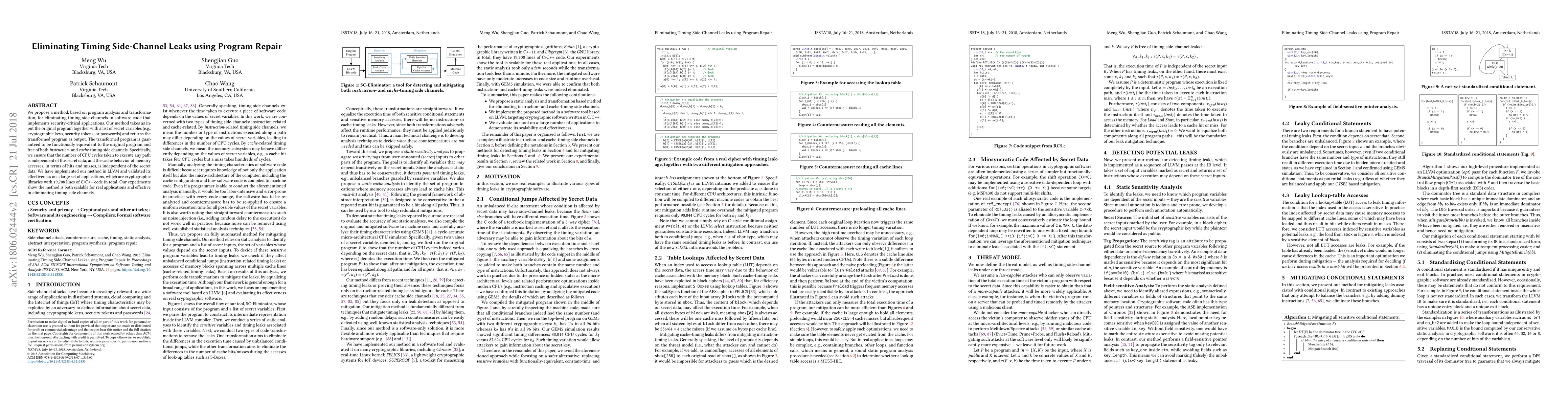 This paper proposes a program analysis and transformation method to eliminate timing side-channel leaks in security-critical applications. The method ensures the transformed program is functionally equivalent to the original while being free of instruction- and cache-timing side channels, validated on cryptographic libraries with 19,708 lines of C/C++ code.