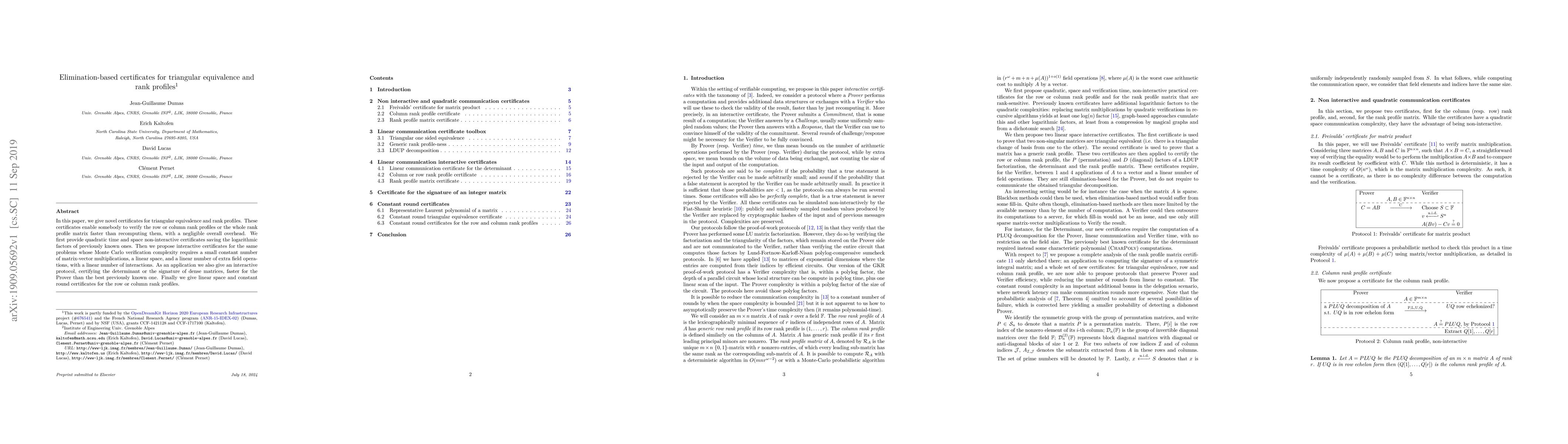 This paper introduces novel certificates for triangular equivalence and rank profiles, allowing for faster verification than recomputing them. It presents non-interactive certificates with improved efficiency and interactive certificates requiring minimal matrix-vector multiplications and interactions, along with an application for faster determinant or signature certification of dense matrices.