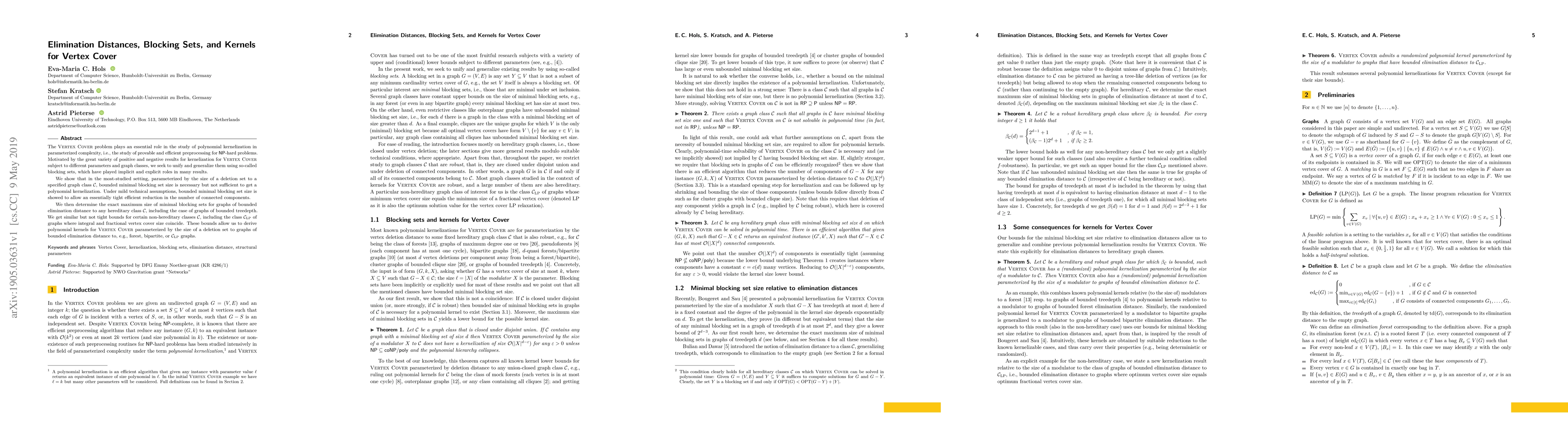 This paper studies the Vertex Cover problem's kernelization, focusing on blocking sets and elimination distances. It shows that bounded minimal blocking set size is necessary but not sufficient for polynomial kernelization, and determines the exact maximum size of minimal blocking sets for graphs with bounded elimination distance to hereditary classes, leading to polynomial kernels for specific graph classes.