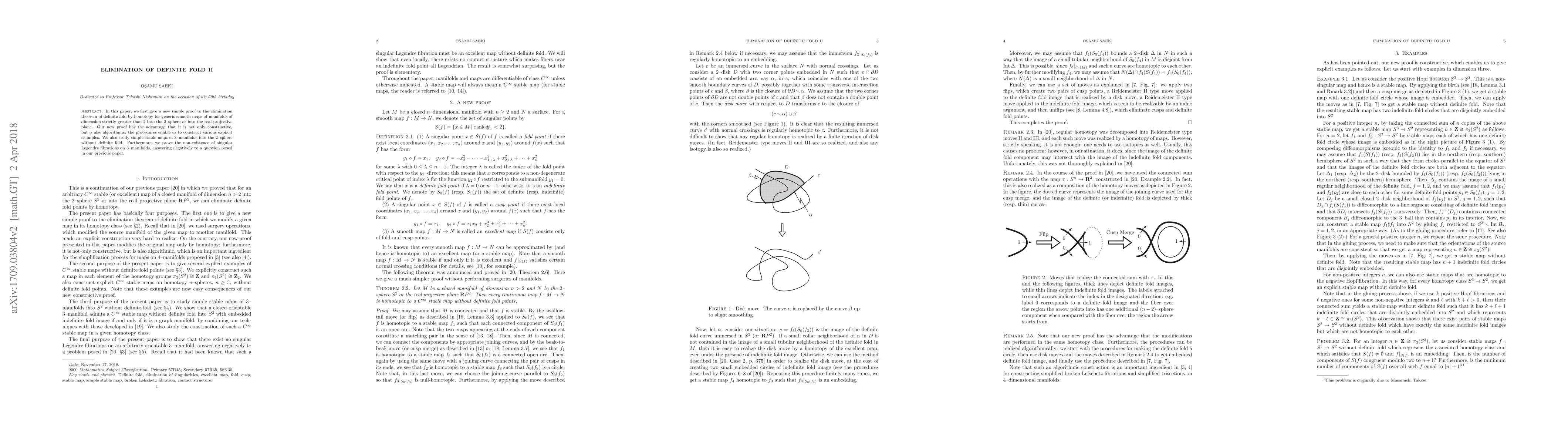 In this paper, we first give a new simple proof to the elimination theorem of definite fold by homotopy for generic smooth maps of manifolds of dimension strictly greater than $2$ into the $2$--sphere or into the real projective plane. Our new proof has the advantage that it is not only constructive, but is also algorithmic: the procedures enable us to construct various explicit examples. We also study simple stable maps of $3$--manifolds into the $2$--sphere without definite fold. Furthermore, we prove the non-existence of singular Legendre fibrations on $3$--manifolds, answering negatively to a question posed in our previous paper.