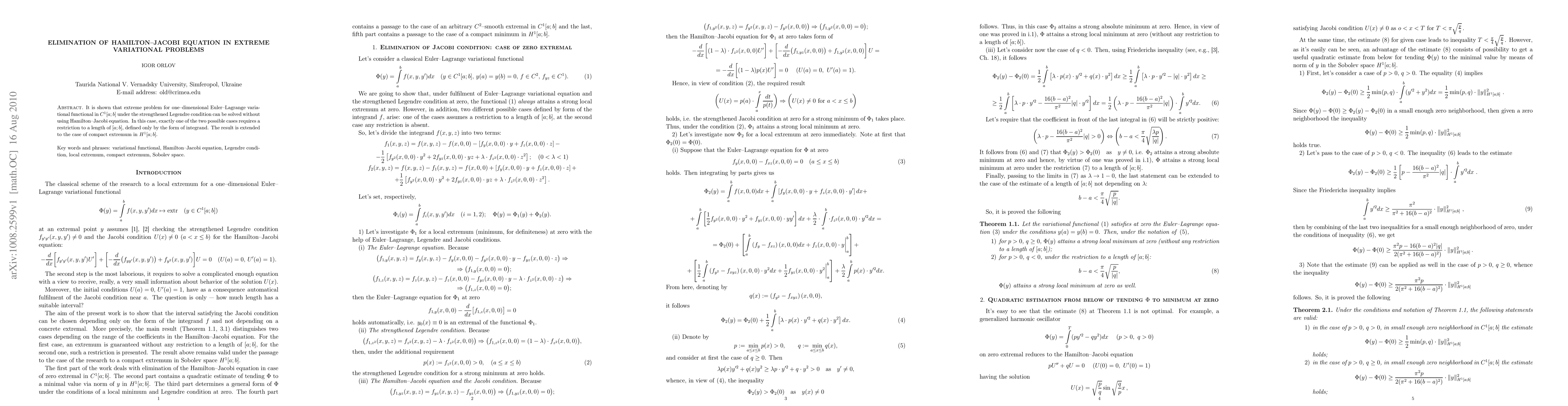 This paper demonstrates that the extreme problem for one-dimensional Euler-Lagrange variational functionals can be solved without resorting to the Hamilton-Jacobi equation, under specific conditions. It also extends the result to compact extremum in $H^1[a;b]$ spaces.