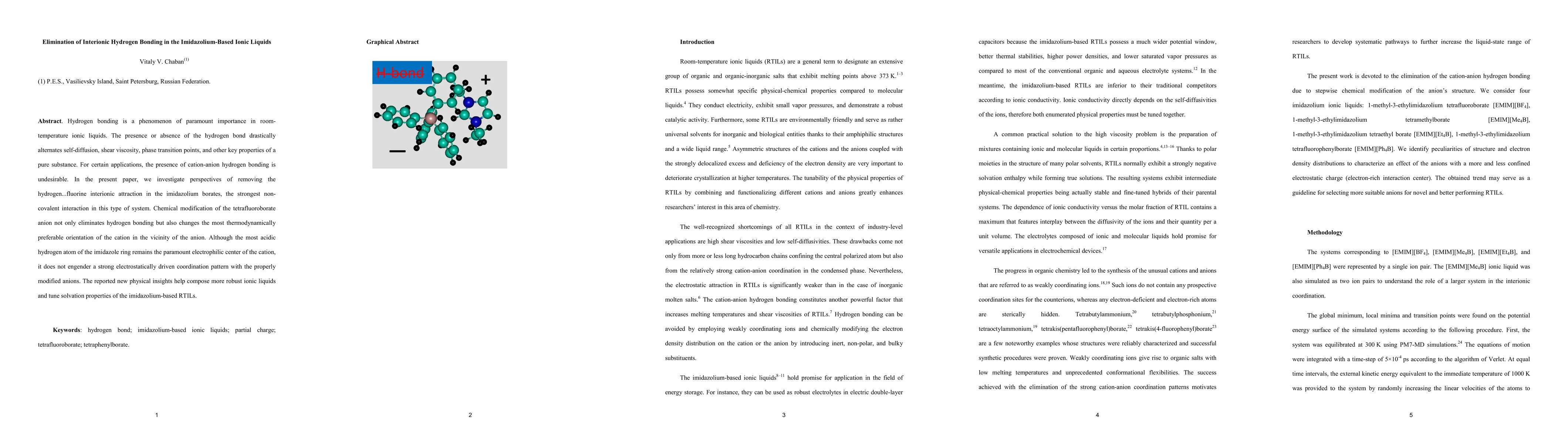 Hydrogen bonding is a phenomenon of paramount importance in room-temperature ionic liquids. The presence or absence of the hydrogen bond drastically alternates self-diffusion, shear viscosity, phase transition points, and other key properties of a pure substance. For certain applications, the presence of cation-anion hydrogen bonding is undesirable. In the present paper, we investigate perspectives of removing the hydrogen...fluorine interionic attraction in the imidazolium borates, the strongest non-covalent interaction in this type of system. Chemical modification of the tetrafluoroborate anion not only eliminates hydrogen bonding but also changes the most thermodynamically preferable orientation of the cation in the vicinity of the anion. Although the most acidic hydrogen atom of the imidazole ring remains the paramount electrophilic center of the cation, it does not engender a strong electrostatically driven coordination pattern with the properly modified anions. The reported new physical insights help compose more robust ionic liquids and tune solvation properties of the imidazolium-based RTILs.