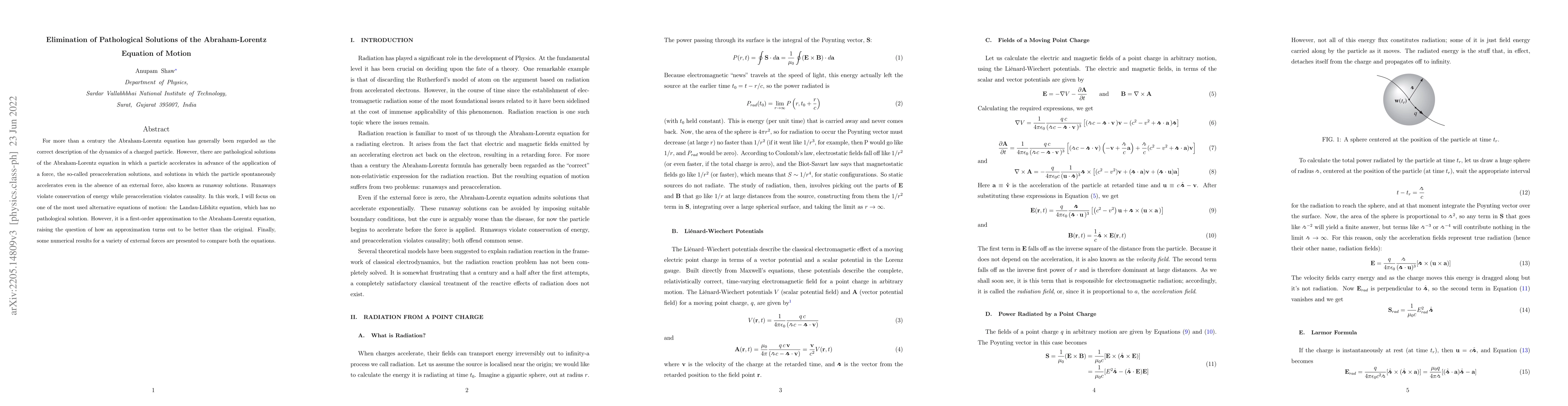 This paper addresses the problematic solutions of the Abraham-Lorentz equation, including preacceleration and runaway solutions, and compares them to the Landau-Lifshitz equation, which avoids these issues but is a first-order approximation. Numerical results demonstrate the superiority of the Landau-Lifshitz equation in avoiding pathological behavior.