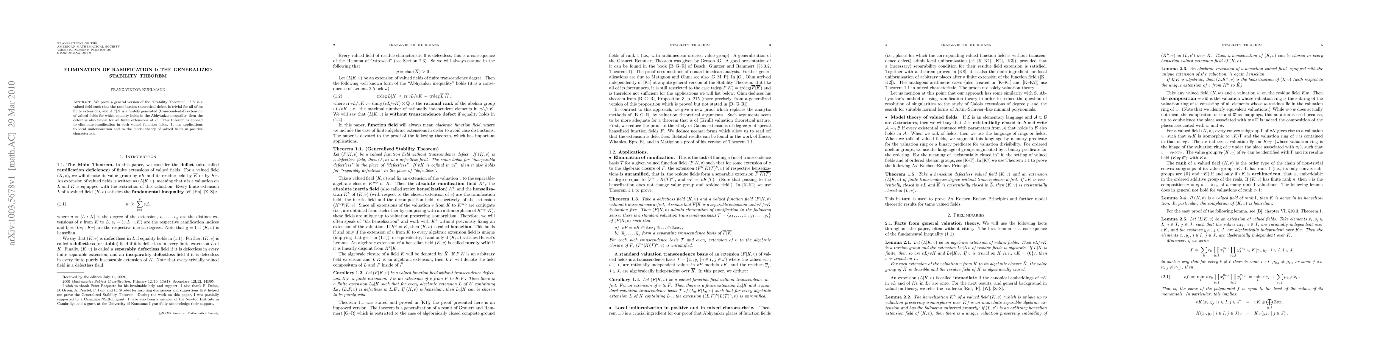 We prove a general version of the "Stability Theorem": if $K$ is a valued field such that the ramification theoretical defect is trivial for all of its finite extensions, and if $F|K$ is a finitely generated (transcendental) extension of valued fields for which equality holds in the Abhyankar inequality, then the defect is also trivial for all finite extensions of $F$. This theorem is applied to eliminate ramification in such valued function fields. It has applications to local uniformization and to the model theory of valued fields in positive characteristic.
