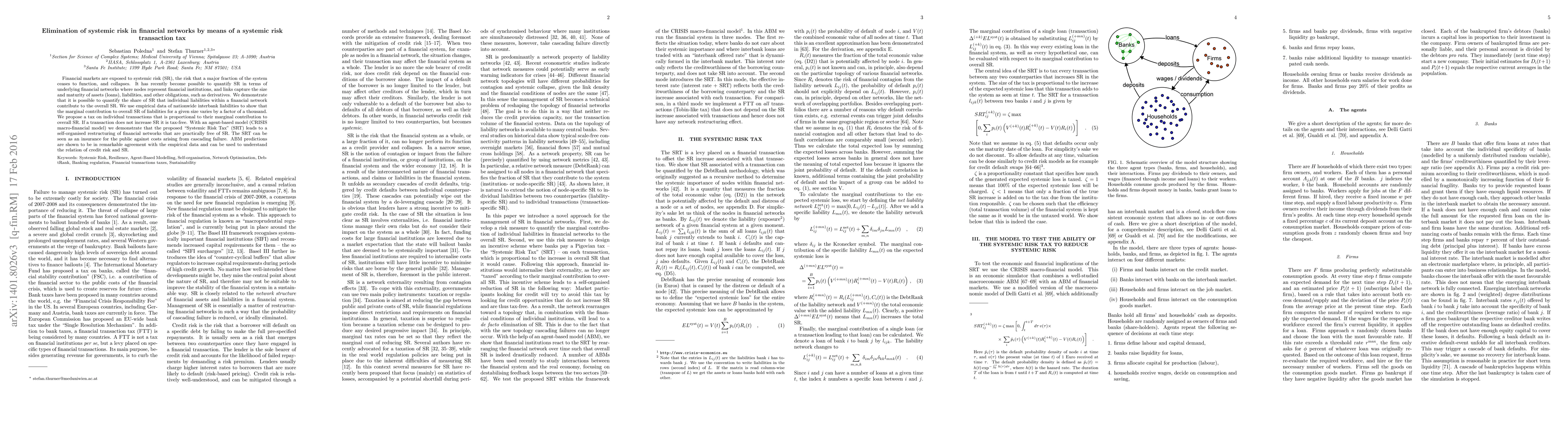 Financial markets are exposed to systemic risk (SR), the risk that a major fraction of the system ceases to function, and collapses. It has recently become possible to quantify SR in terms of underlying financial networks where nodes represent financial institutions, and links capture the size and maturity of assets (loans), liabilities, and other obligations, such as derivatives. We demonstrate that it is possible to quantify the share of SR that individual liabilities within a financial network contribute to the overall SR. We use empirical data of nationwide interbank liabilities to show that the marginal contribution to overall SR of liabilities for a given size varies by a factor of a thousand. We propose a tax on individual transactions that is proportional to their marginal contribution to overall SR. If a transaction does not increase SR it is tax-free. With an agent-based model (CRISIS macro-financial model) we demonstrate that the proposed "Systemic Risk Tax" (SRT) leads to a self-organised restructuring of financial networks that are practically free of SR. The SRT can be seen as an insurance for the public against costs arising from cascading failure. ABM predictions are shown to be in remarkable agreement with the empirical data and can be used to understand the relation of credit risk and SR.