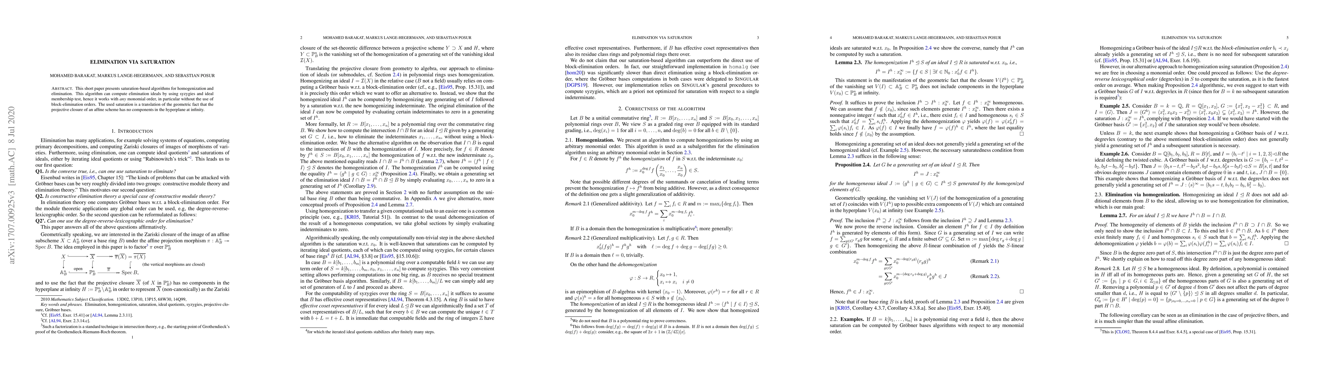 This short paper presents saturation-based algorithms for homogenization and elimination. This algorithm can compute elimination ideals by using syzygies and ideal membership test, hence it works with any} monomial order, in particular without the use of block-elimination orders. The used saturation is a translation of the geometric fact that the projective closure of an affine scheme has no components in the hyperplane at infinity.