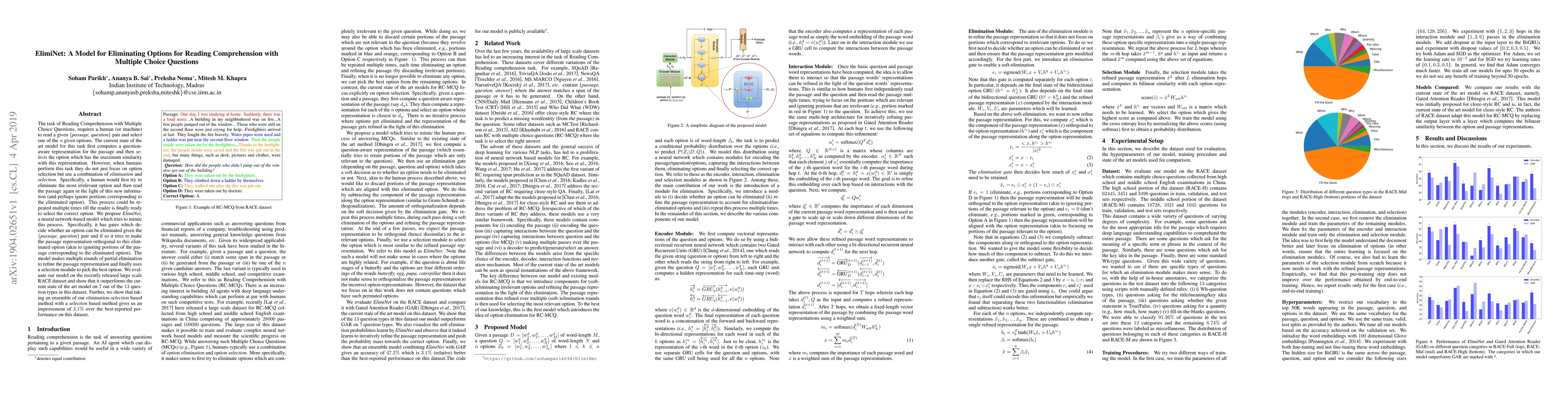 ElimiNet is a novel neural network model designed to enhance reading comprehension for multiple-choice questions by mimicking human elimination strategies. It outperforms current models by iteratively eliminating irrelevant options and refining passage representations before selecting the best option, achieving better results on the RACE dataset.
