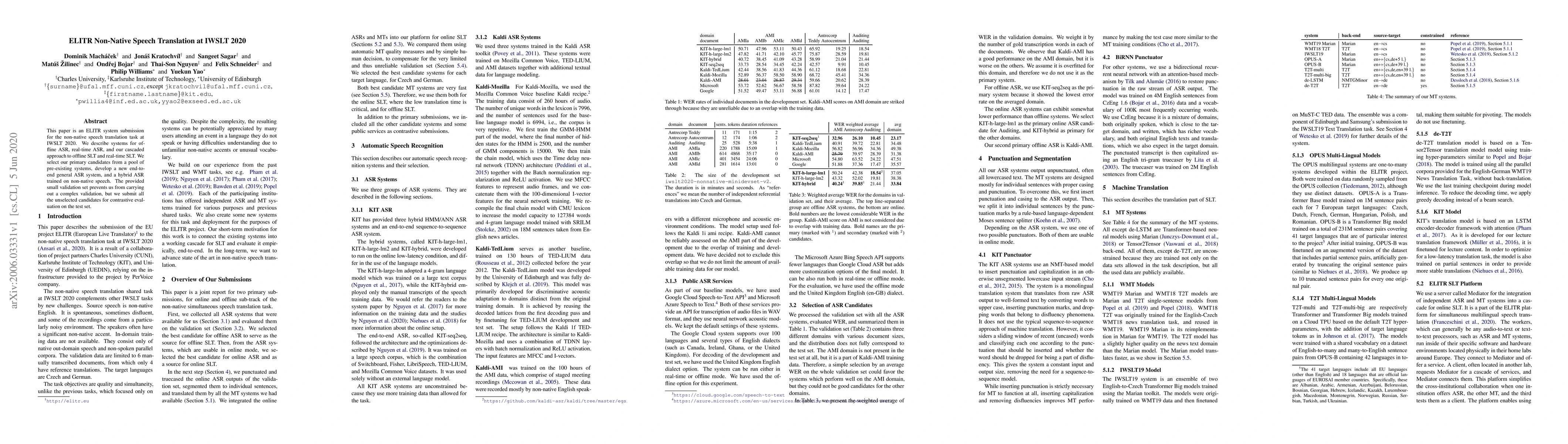 This paper presents a non-native speech translation system with offline and real-time ASR and SLT models, using pre-existing systems as primary candidates and developing new end-to-end ASR and hybrid ASR models.