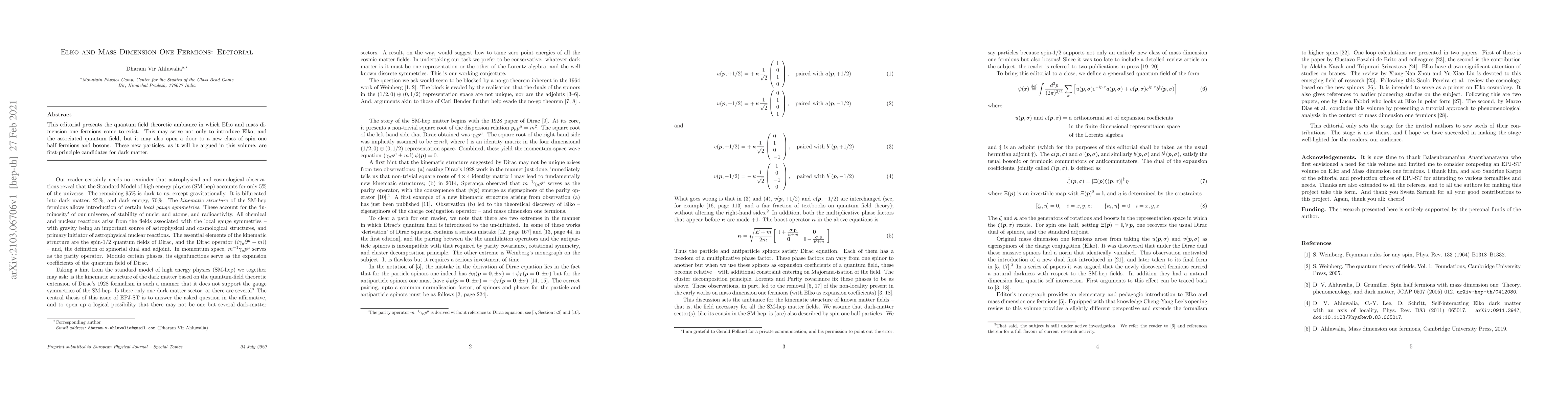 This editorial explores the quantum field theory context for Elko and mass dimension one fermions, proposing them as a new class of spin one-half particles and potential dark matter candidates.