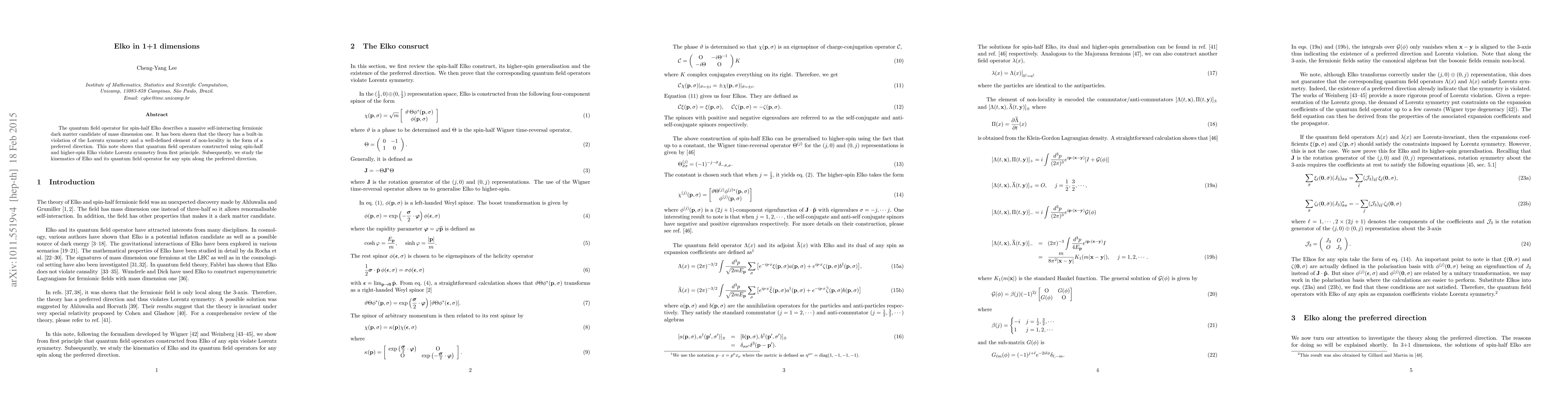 The quantum field operator for spin-half Elko describes a massive self-interacting fermionic dark matter candidate of mass dimension one. It has been shown that the theory has a built-in violation of the Lorentz symmetry and a well-defined element of non-locality in the form of a preferred direction. This note shows that quantum field operators constructed using spin-half and higher-spin Elko violate Lorentz symmetry from first principle. Subsequently, we study the kinematics of Elko and its quantum field operator for any spin along the preferred direction.