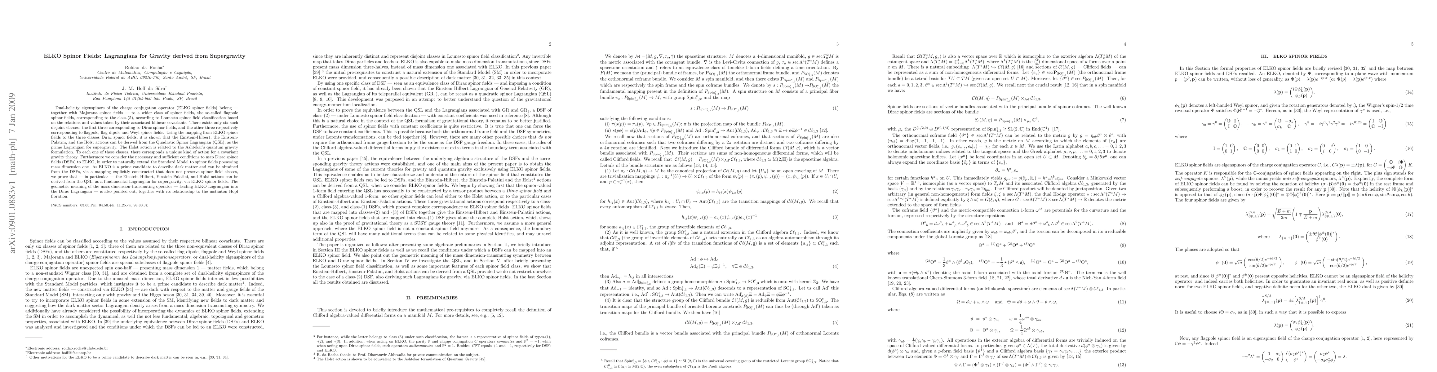 Dual-helicity eigenspinors of the charge conjugation operator (ELKO spinor fields) belong -- together with Majorana spinor fields -- to a wider class of spinor fields, the so-called flagpole spinor fields, corresponding to the class-(5), according to Lounesto spinor field classification based on the relations and values taken by their associated bilinear covariants. There exists only six such disjoint classes: the first three corresponding to Dirac spinor fields, and the other three respectively corresponding to flagpole, flag-dipole and Weyl spinor fields. Using the mapping from ELKO spinor fields to the three classes Dirac spinor fields, it is shown that the Einstein-Hilbert, the Einstein-Palatini, and the Holst actions can be derived from the Quadratic Spinor Lagrangian (QSL), as the prime Lagrangian for supergravity. The Holst action is related to the Ashtekar's quantum gravity formulation. To each one of these classes, there corresponds a unique kind of action for a covariant gravity theory. Furthermore we consider the necessary and sufficient conditions to map Dirac spinor fields (DSFs) to ELKO, in order to naturally extend the Standard Model to spinor fields possessing mass dimension one. As ELKO is a prime candidate to describe dark matter and can be obtained from the DSFs, via a mapping explicitly constructed that does not preserve spinor field classes, we prove that in particular the Einstein-Hilbert, Einstein-Palatini, and Holst actions can be derived from the QSL, as a fundamental Lagrangian for supergravity, via ELKO spinor fields. The geometric meaning of the mass dimension-transmuting operator - leading ELKO Lagrangian into the Dirac Lagrangian - is also pointed out, together with its relationship to the instanton Hopf fibration.