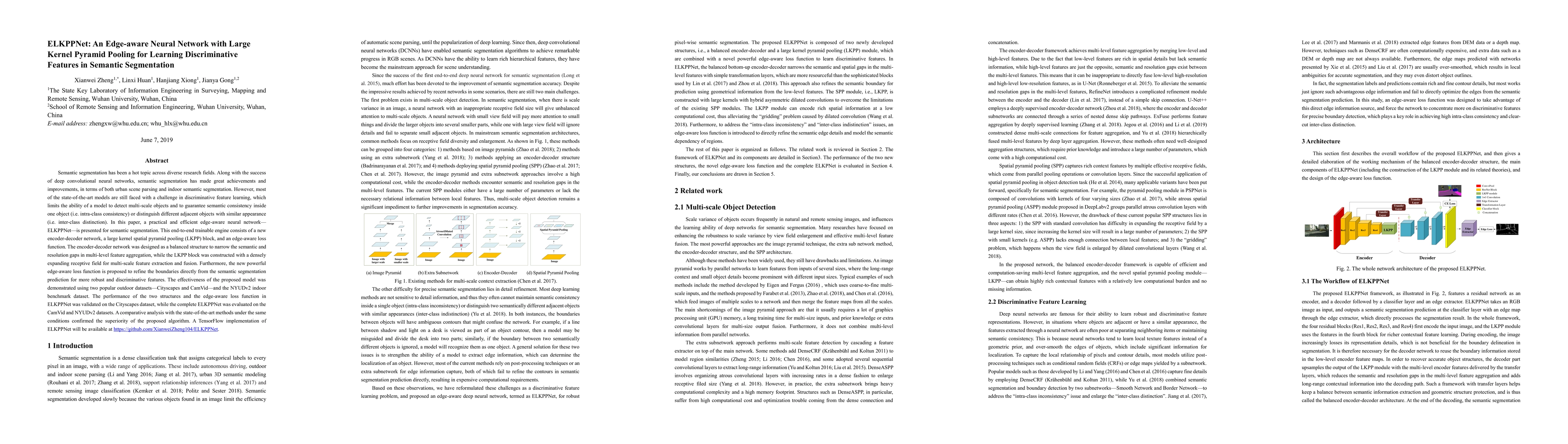 ELKPPNet introduces an edge-aware neural network with large kernel pyramid pooling for semantic segmentation, enhancing multi-scale feature extraction and discriminative feature learning. The model's effectiveness was validated on Cityscapes, CamVid, and NYUDv2 datasets, outperforming state-of-the-art methods.