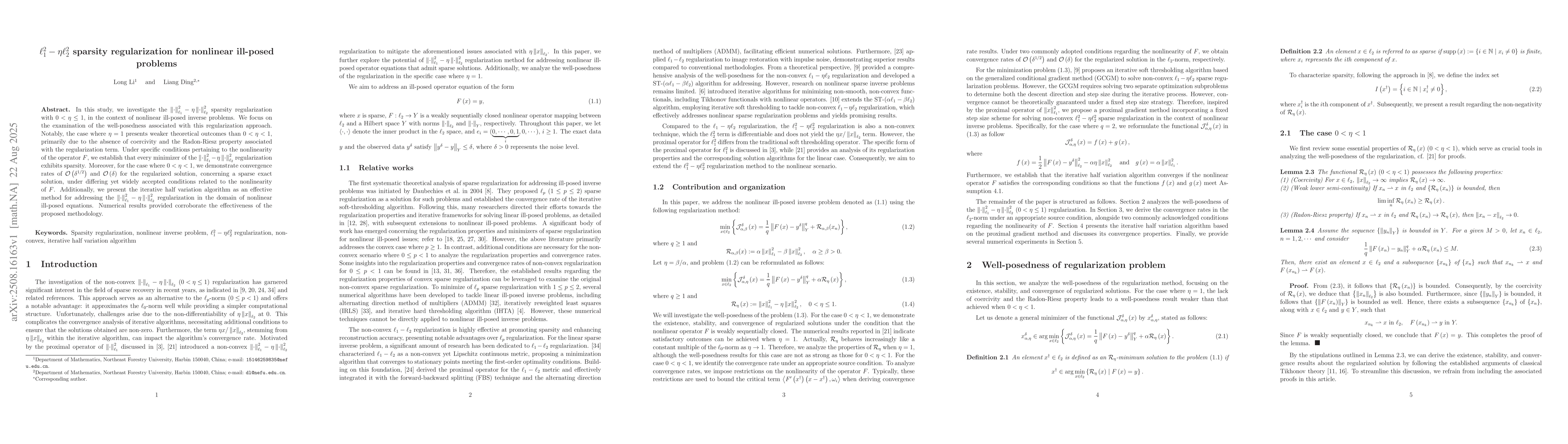 In this study, we investigate the $\left\|\cdot\right\|_{\ell_{1}}^{2}-\eta\left\|\cdot\right\|_{\ell_{2}}^{2}$ sparsity regularization with $0< \eta\leq 1$, in the context of nonlinear ill-posed inverse problems. We focus on the examination of the well-posedness associated with this regularization approach. Notably, the case where $\eta=1$ presents weaker theoretical outcomes than $0< \eta<1$, primarily due to the absence of coercivity and the Radon-Riesz property associated with the regularization term. Under specific conditions pertaining to the nonlinearity of the operator $F$, we establish that every minimizer of the $\left\|\cdot\right\|_{\ell_{1}}^{2}-\eta\left\|\cdot\right\|_{\ell_{2}}^{2}$ regularization exhibits sparsity. Moreover, for the case where $0<\eta<1$, we demonstrate convergence rates of $\mathcal{O}\left(\delta^{1/2}\right)$ and $\mathcal{O}\left(\delta\right)$ for the regularized solution, concerning a sparse exact solution, under differing yet widely accepted conditions related to the nonlinearity of $F$. Additionally, we present the iterative half variation algorithm as an effective method for addressing the $\left\|\cdot\right\|_{\ell_{1}}^{2}-\eta\left\|\cdot\right\|_{\ell_{2}}^{2}$ regularization in the domain of nonlinear ill-posed equations. Numerical results provided corroborate the effectiveness of the proposed methodology.