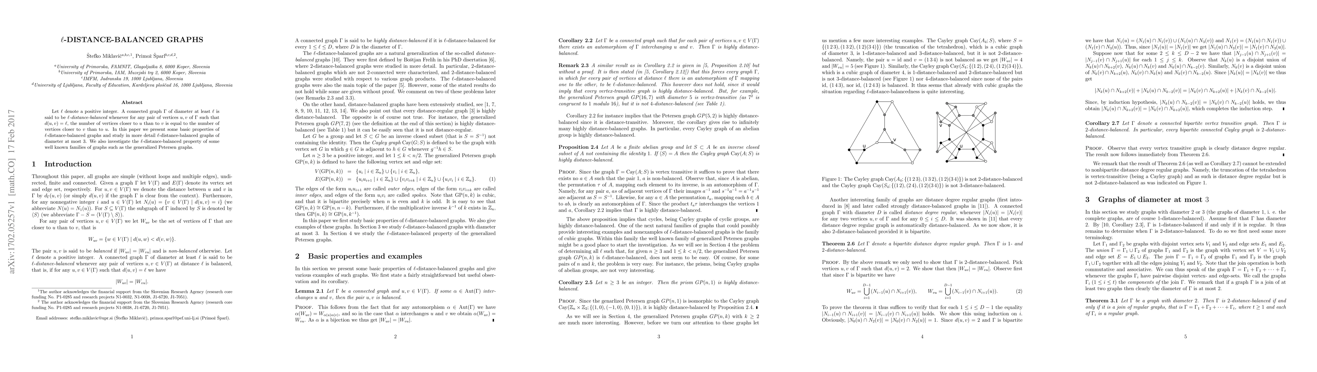 This paper defines $\ell$-distance-balanced graphs, where for any pair of vertices at distance $\ell$, the number of vertices closer to one is equal to those closer to the other. The study focuses on properties of these graphs, particularly those with diameter at most 3, and examines the $\ell$-distance-balanced property in generalized Petersen graphs.