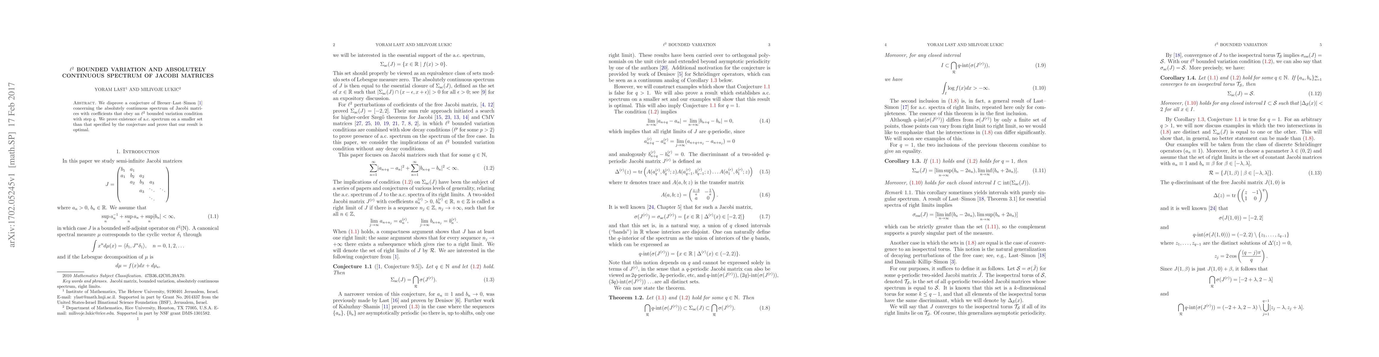 Researchers disprove a conjecture about Jacobi matrices with $ell^2$ bounded variation, showing existence of absolutely continuous spectrum on a smaller set than previously thought.