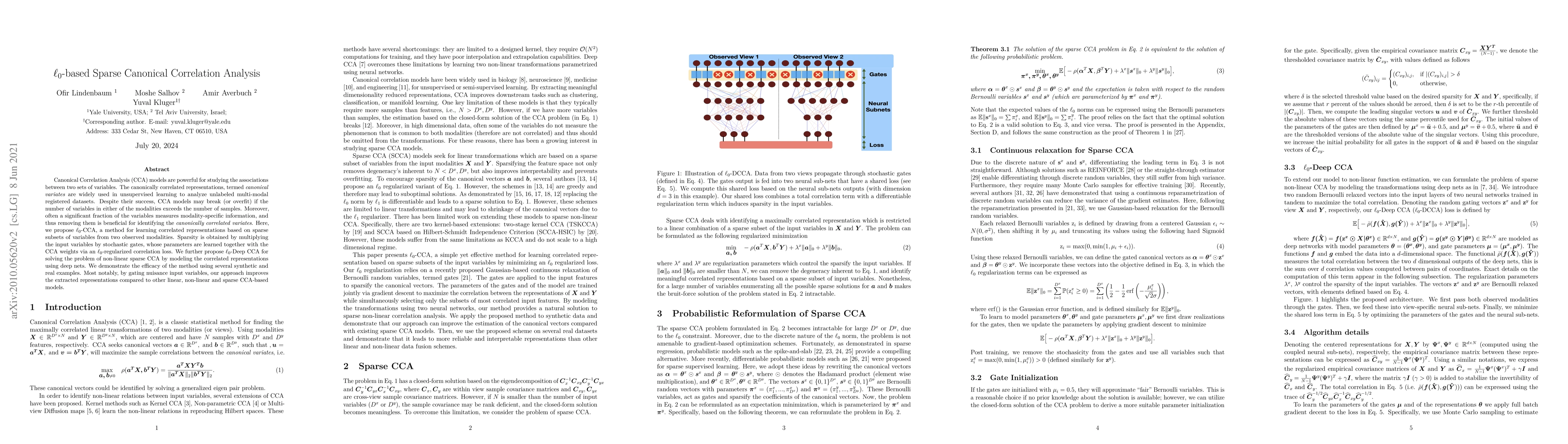 This paper introduces $\ell_0$-CCA, a method for sparse Canonical Correlation Analysis that identifies correlated representations by focusing on sparse subsets of variables from two modalities, using $\ell_0$-regularization to achieve sparsity. It also extends this approach to $\ell_0$-Deep CCA for non-linear sparse CCA, demonstrating improved performance over other models by gating out irrelevant variables.