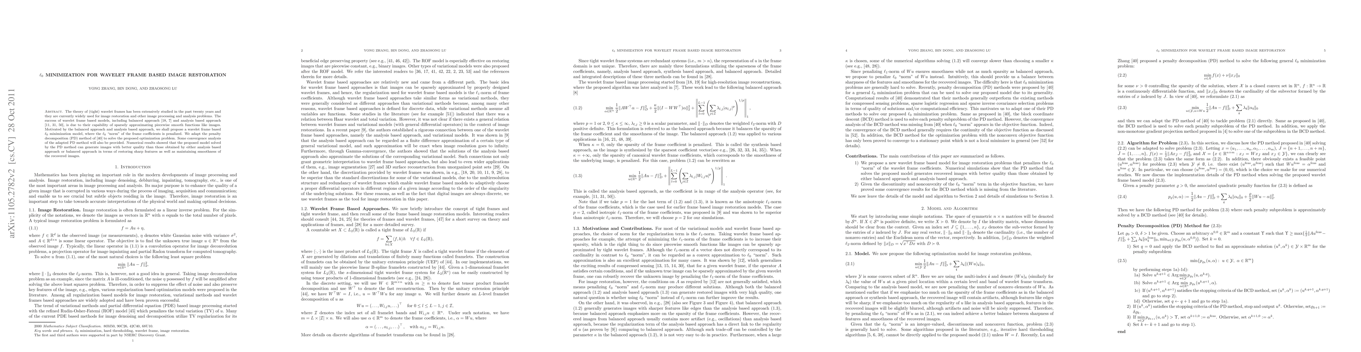 This paper proposes a wavelet frame based $\ell_0$ minimization model for image restoration, utilizing the balanced and analysis approaches. The adapted penalty decomposition method effectively solves the optimization problem, yielding images with better feature restoration and smoother results compared to existing methods.