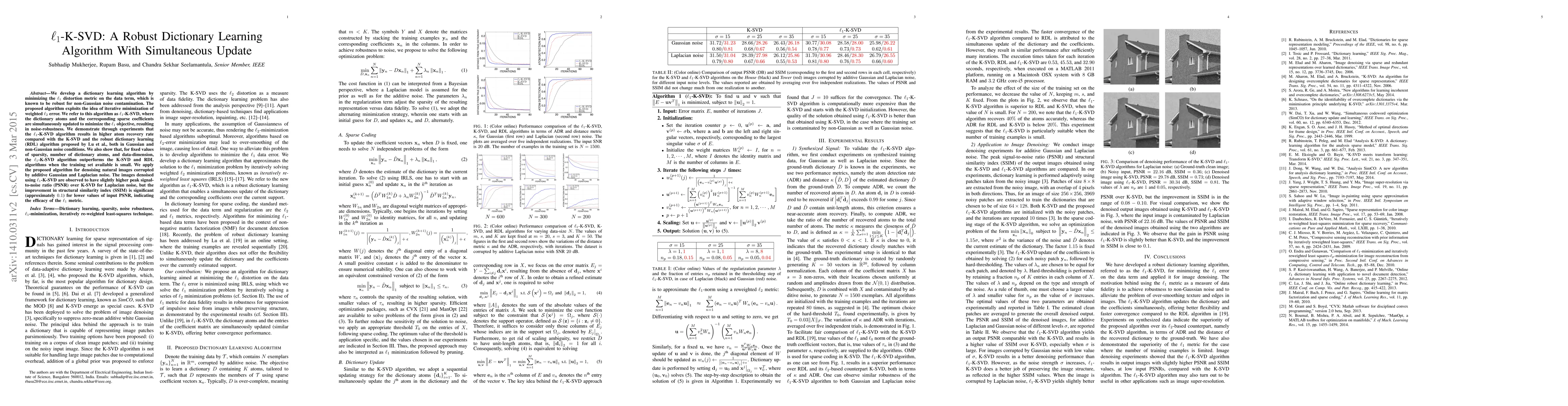 The $\ell_1$-K-SVD algorithm is developed for robust dictionary learning by minimizing the $\ell_1$ distortion metric, showing higher noise-robustness and atom recovery rates compared to K-SVD and RDL, especially under limited training data and non-Gaussian noise. It achieves better denoising performance for natural images, with notable improvements in structural similarity index (SSIM).
