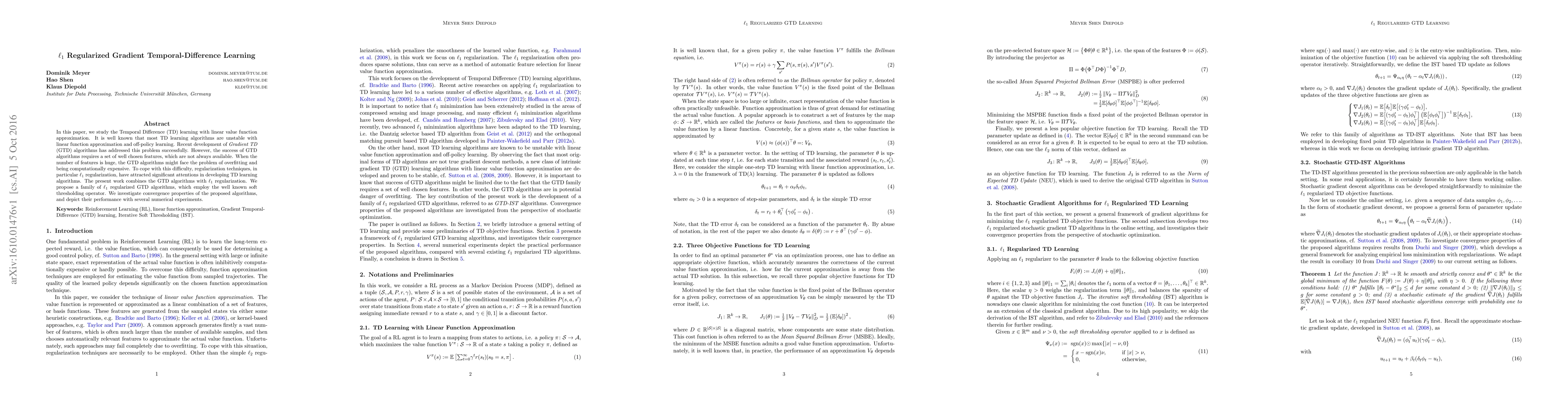 This paper proposes $\ell_1$ regularized Gradient Temporal-Difference (GTD) algorithms to address instability and overfitting issues in TD learning with linear value function approximation. The study investigates the convergence properties and performance of these algorithms through numerical experiments.