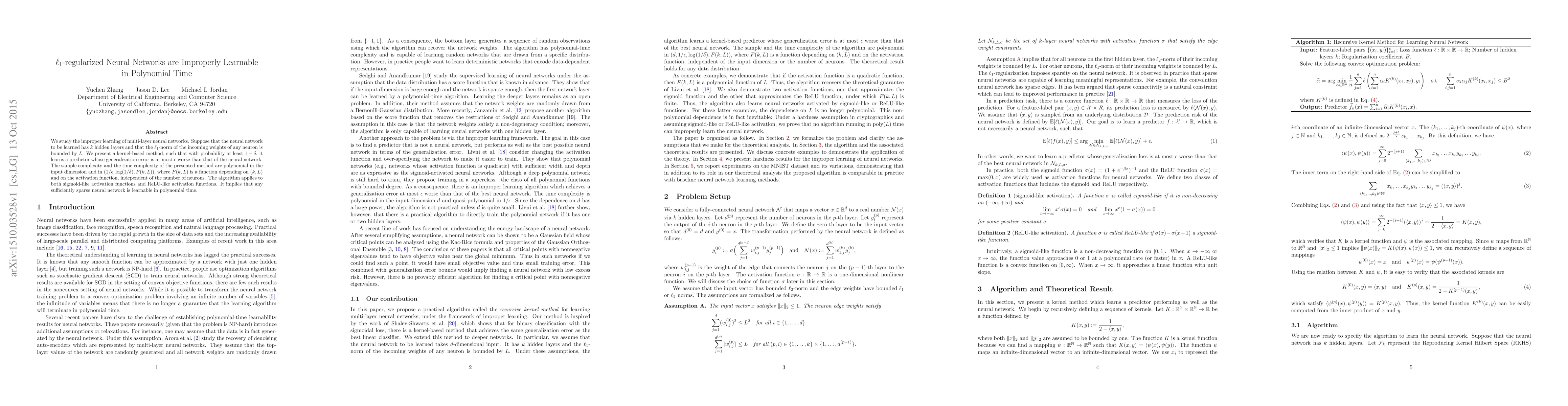 This paper presents a polynomial-time kernel-based method for improperly learning $\ell_1$-regularized neural networks with bounded incoming weights, achieving generalization error within $\epsilon$ of the true network. The method applies to both sigmoid-like and ReLU-like activation functions, demonstrating that sufficiently sparse neural networks can be learned efficiently.