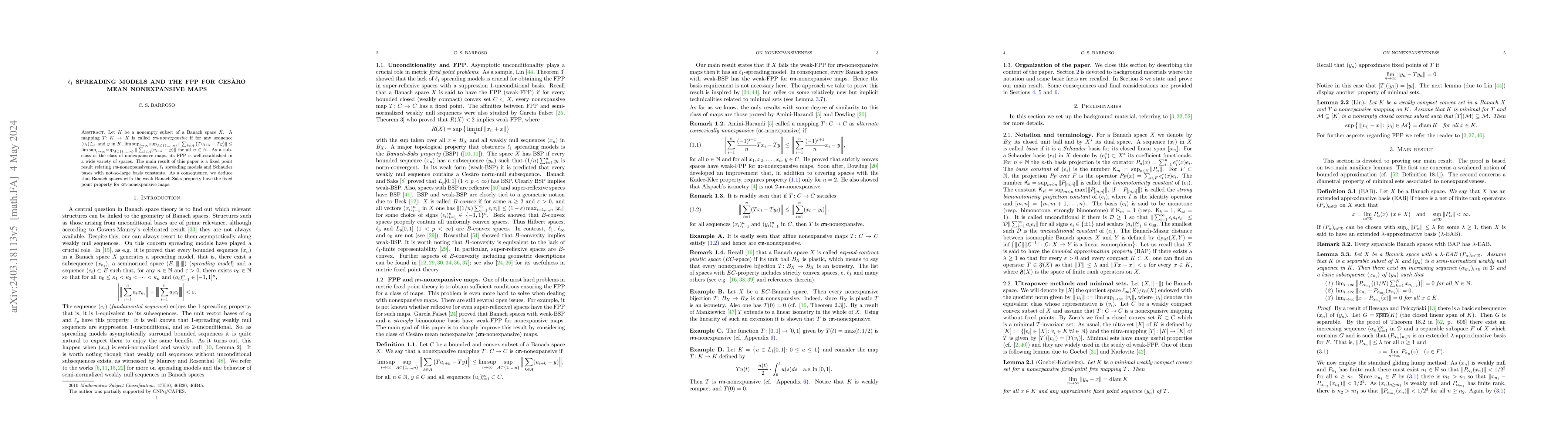 Let $K$ be a nonempty subset of a Banach space $X$. A mapping $T\colon K\to K$ is called $\mathfrak{cm}$-nonexpansive if for any sequence $(u_i)_{i=1}^\infty$ and $y$ in $K$, $\limsup_{i\to\infty} \sup_{A\subset\{1,\dots, n\}}\|\sum_{k\in A} \big(T u_{i+k} - Ty\big)\|\leq \limsup_{i\to\infty} \sup_{A\subset\{1,\dots, n\}}\|\sum_{k\in A} (u_{i+k} - y)\|$ for all $n\in\mathbb{N}$. As a subclass of the class of nonexpansive maps, its FPP is well-established in a wide variety of spaces. The main result of this paper is a fixed point result relating $\mathfrak{cm}$-nonexpansiveness, $\ell_1$ spreading models and Schauder bases with not-so-large basis constants. As a consequence, we deduce that Banach spaces with the weak Banach-Saks property have the fixed point property for $\mathfrak{cm}$-nonexpansive maps.