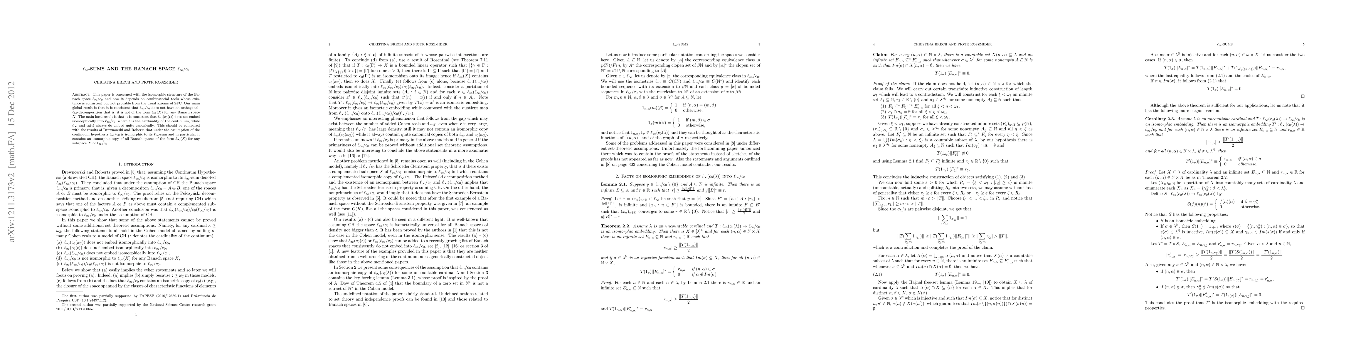 This paper is concerned with the isomorphic structure of the Banach space $\ell_\infty/c_0$ and how it depends on combinatorial tools whose existence is consistent but not provable from the usual axioms of ZFC. Our main global result is that it is consistent that $\ell_\infty/c_0$ does not have an orthogonal \break $\ell_\infty$-decomposition that is, it is not of the form $\ell_\infty(X)$ for any Banach space $X$. The main local result is that it is consistent that $\ell_\infty(c_0(\mathfrak{c}))$ does not embed isomorphically into $\ell_\infty/c_0$, where $\mathfrak{c}$ is the cardinality of the continuum, while $\ell_\infty$ and $c_0(\mathfrak{c})$ always do embed quite canonically. This should be compared with the results of Drewnowski and Roberts that under the assumption of the continuum hypothesis $\ell_\infty/c_0$ is isomorphic to its $\ell_\infty$-sum and in particular it contains an isomorphic copy of all Banach spaces of the form $\ell_\infty(X)$ for any subspace $X$ of $\ell_\infty/c_0$.