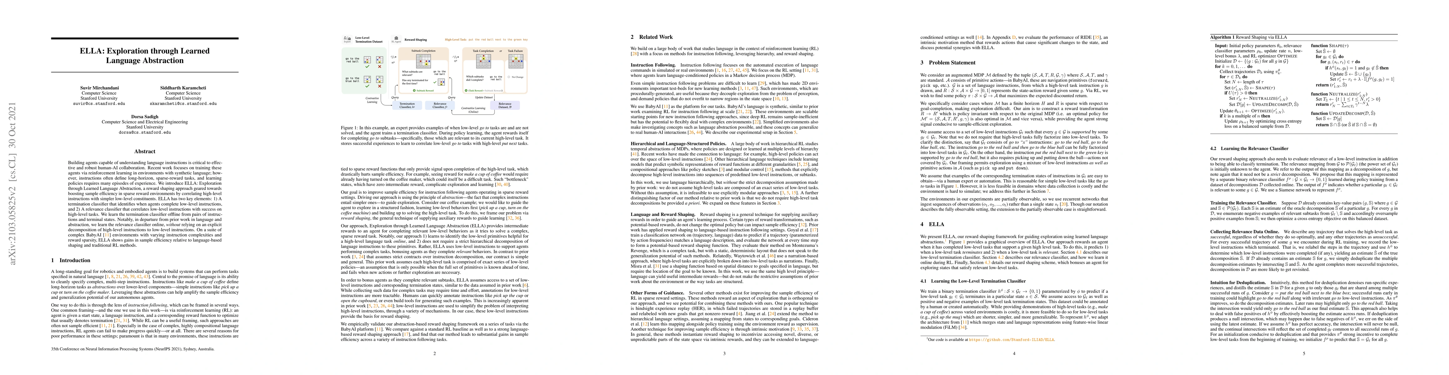 Building agents capable of understanding language instructions is critical to effective and robust human-AI collaboration. Recent work focuses on training these agents via reinforcement learning in environments with synthetic language; however, instructions often define long-horizon, sparse-reward tasks, and learning policies requires many episodes of experience. We introduce ELLA: Exploration through Learned Language Abstraction, a reward shaping approach geared towards boosting sample efficiency in sparse reward environments by correlating high-level instructions with simpler low-level constituents. ELLA has two key elements: 1) A termination classifier that identifies when agents complete low-level instructions, and 2) A relevance classifier that correlates low-level instructions with success on high-level tasks. We learn the termination classifier offline from pairs of instructions and terminal states. Notably, in departure from prior work in language and abstraction, we learn the relevance classifier online, without relying on an explicit decomposition of high-level instructions to low-level instructions. On a suite of complex BabyAI environments with varying instruction complexities and reward sparsity, ELLA shows gains in sample efficiency relative to language-based shaping and traditional RL methods.