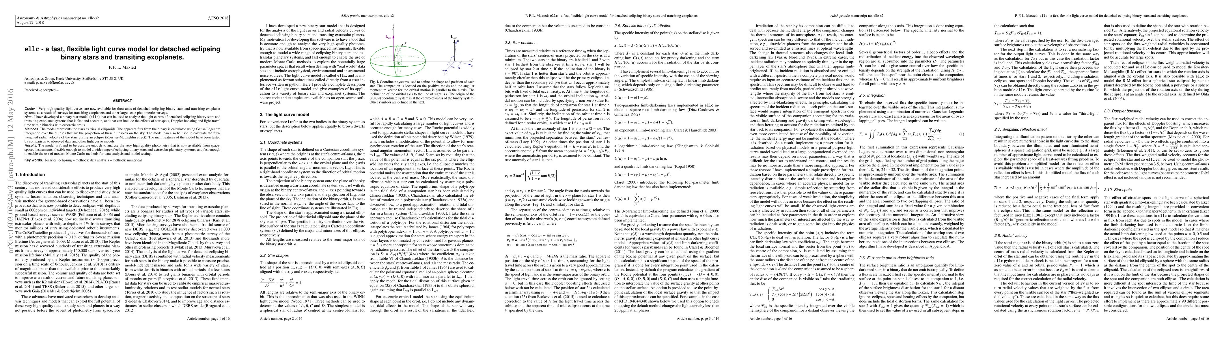 The paper introduces ELLC, a binary star model for analyzing light curves of detached eclipsing binary stars and transiting exoplanet systems. ELLC represents stars as triaxial ellipsoids and calculates flux using Gauss-Legendre integration over projected ellipse areas. It also models star spots, Doppler boosting, and light-travel time in eccentric binaries, and calculates the Rossiter-McLaughlin effect.