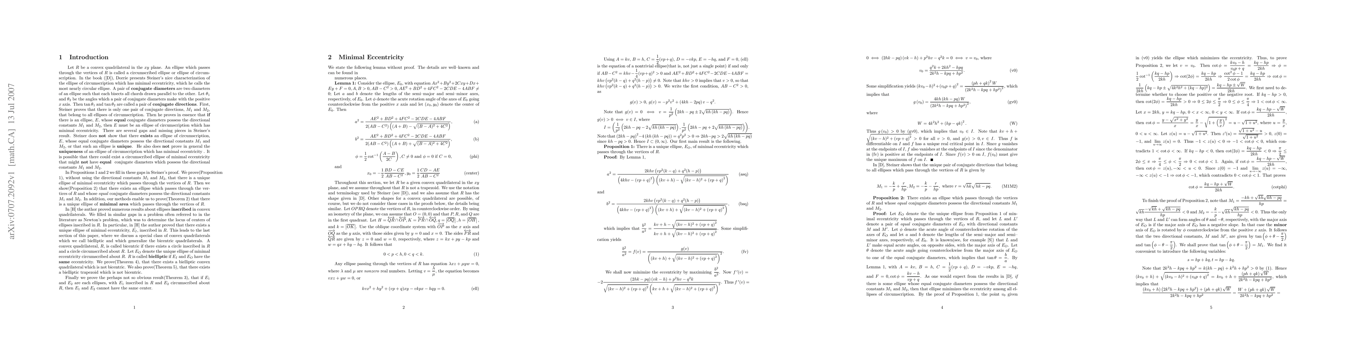 First, we fill in key gaps in Steiner's nice characterization of the most nearly circular ellipse which passes through the vertices of a convex quadrilateral, D. Steiner proved that there is only one pair of conjugate directions, M1 and M2, that belong to all ellipses of circumscription. Then he proves that if there is an ellipse, E, whose equal conjugate diameters possess the directional constants M1 and M2, then E must be an ellipse of circumscription which has minimal eccentricity. However, Steiner does not show the existence or uniqueness of such an ellipse. We prove that there is a unique ellipse of minimal eccentricity which passes through the vertices of D. We also show that there exists an ellipse which passes through the vertices of D and whose equal conjugate diameters possess the directional constants M1 and M2. We also show that there exists a unique ellipse of minimal area which passes through the vertices of D. Finally, we call a convex quadrilateral, D, bielliptic if the unique inscribed and circumscribed ellipses of minimal eccentricity have the same eccentricity. This generalizes the notion of bicentric quadrilaterals. In particular we show the existence of a bielliptic convex quadrilateral which is not bicentric.