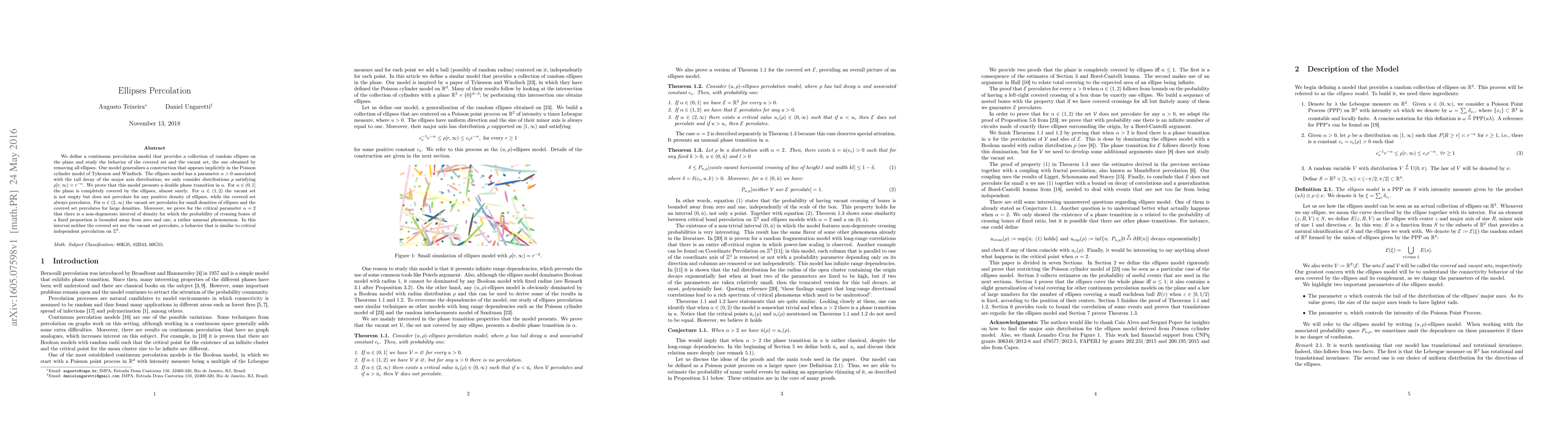 This paper introduces a continuum percolation model of random ellipses on the plane, analyzing the behavior of covered and vacant sets. It reveals a double phase transition in the parameter $\alpha$, showing that the plane is fully covered for $\alpha \in (0,1]$, while for $\alpha \in (1,2)$ the covered set percolates but the vacant set does not. For $\alpha \in (2, \infty)$, the vacant set percolates at low densities, and the covered set percolates at high densities.