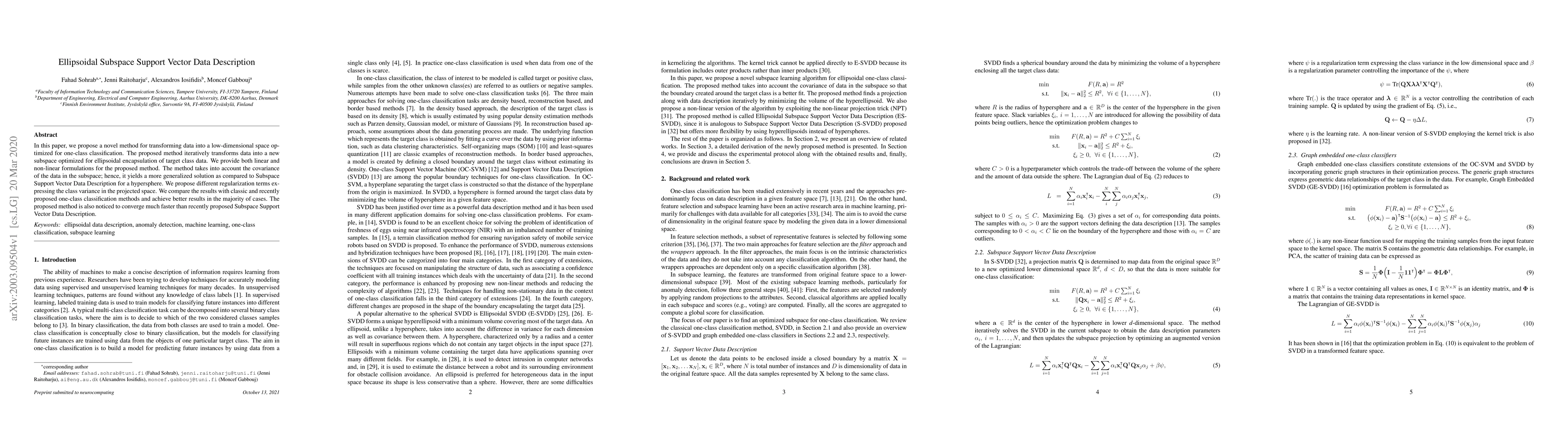 In this paper, we propose a novel method for transforming data into a low-dimensional space optimized for one-class classification. The proposed method iteratively transforms data into a new subspace optimized for ellipsoidal encapsulation of target class data. We provide both linear and non-linear formulations for the proposed method. The method takes into account the covariance of the data in the subspace; hence, it yields a more generalized solution as compared to Subspace Support Vector Data Description for a hypersphere. We propose different regularization terms expressing the class variance in the projected space. We compare the results with classic and recently proposed one-class classification methods and achieve better results in the majority of cases. The proposed method is also noticed to converge much faster than recently proposed Subspace Support Vector Data Description.