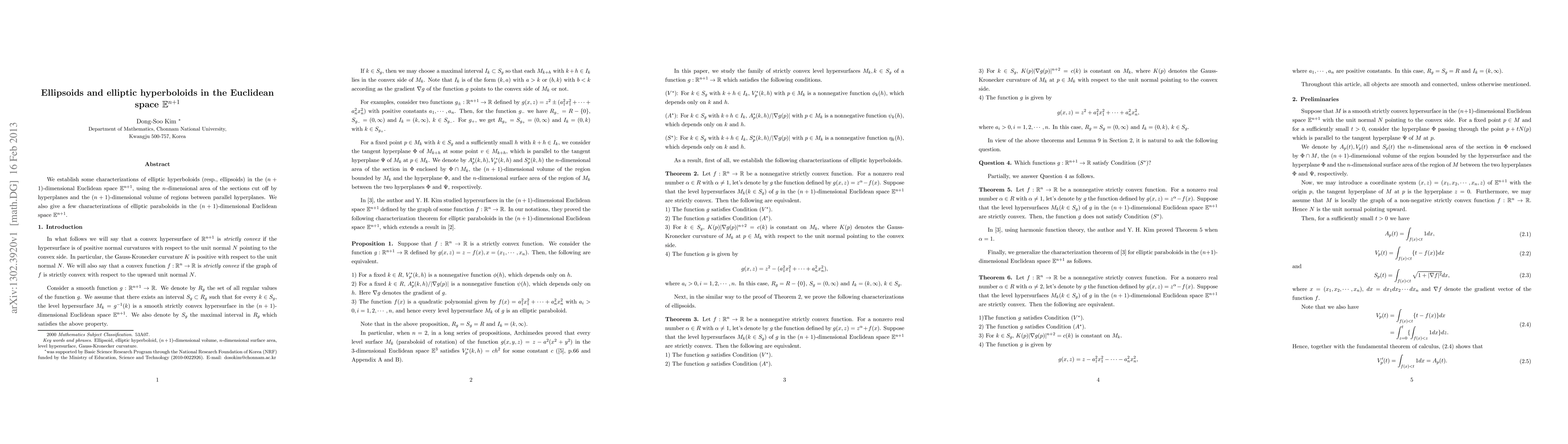 We establish some characterizations of elliptic hyperboloids (resp., ellipsoids) in the $(n+1)$-dimensional Euclidean space ${\Bbb E}^{n+1}$, using the $n$-dimensional area of the sections cut off by hyperplanes and the $(n+1)$-dimensional volume of regions between parallel hyperplanes. We also give a few characterizations of elliptic paraboloids in the $(n+1)$-dimensional Euclidean space ${\Bbb E}^{n+1}$.