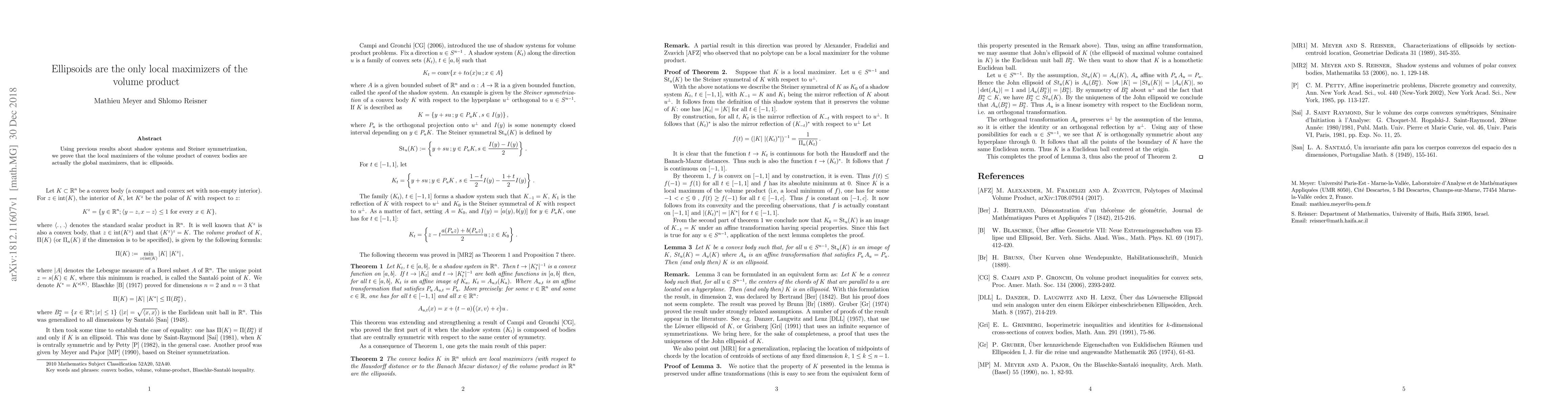 Summary: This paper demonstrates that ellipsoids are the sole local maximizers of the volume product for convex bodies, leveraging results from shadow systems and Steiner symmetrization to establish their global optimality.