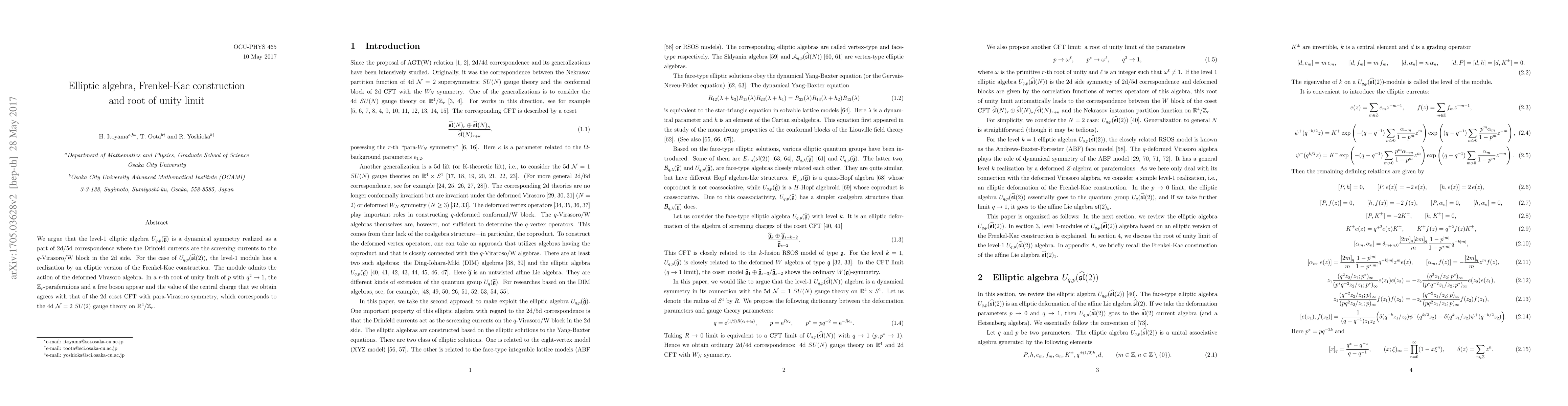 We argue that the level-$1$ elliptic algebra $U_{q,p}(\widehat{\mathfrak{g}})$ is a dynamical symmetry realized as a part of 2d/5d correspondence where the Drinfeld currents are the screening currents to the $q$-Virasoro/W block in the 2d side. For the case of $U_{q,p}(\widehat{\mathfrak{sl}}(2))$, the level-$1$ module has a realization by an elliptic version of the Frenkel-Kac construction. The module admits the action of the deformed Virasoro algebra. In a $r$-th root of unity limit of $p$ with $q^2 \rightarrow 1$, the $\mathbb{Z}_r$-parafermions and a free boson appear and the value of the central charge that we obtain agrees with that of the 2d coset CFT with para-Virasoro symmetry, which corresponds to the 4d $\mathcal{N}=2$ $SU(2)$ gauge theory on $\mathbb{R}^4/\mathbb{Z}_r$.