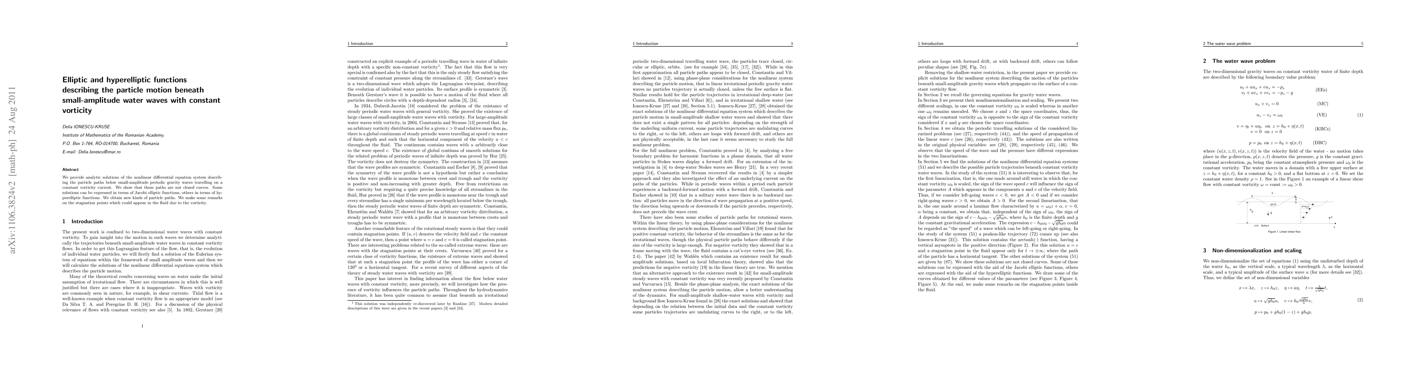 This paper provides analytic solutions for particle motion under small-amplitude periodic waves in a fluid with constant vorticity, revealing that paths are not closed and can be described using Jacobi elliptic and hyperelliptic functions. It also discusses the potential for stagnation points due to vorticity.