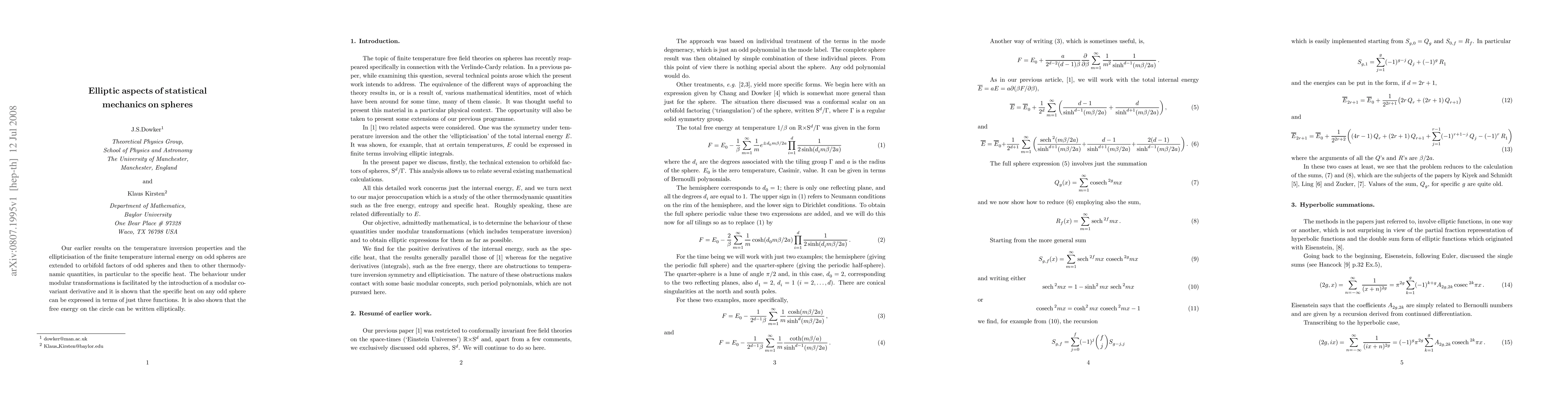 Our earlier results on the temperature inversion properties and the ellipticisation of the finite temperature internal energy on odd spheres are extended to orbifold factors of odd spheres and then to other thermodynamic quantities, in particular to the specific heat. The behaviour under modular transformations is facilitated by the introduction of a modular covariant derivative and it is shown that the specific heat on any odd sphere can be expressed in terms of just three functions. It is also shown that the free energy on the circle can be written elliptically.