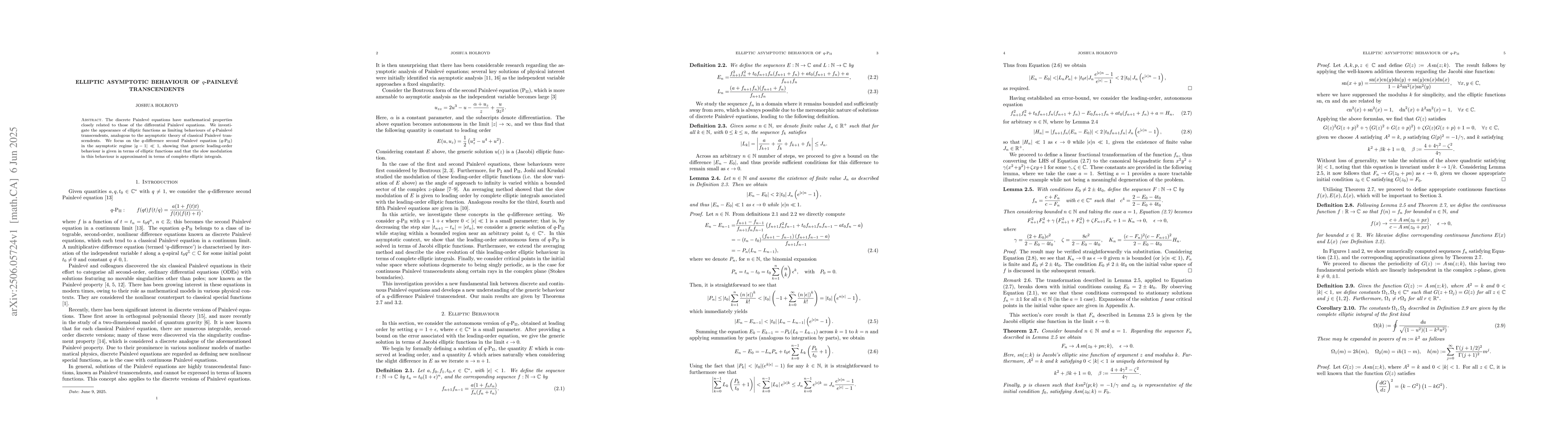 The paper investigates $q$-Painlevé transcendents' behavior in the asymptotic regime $|q-1| o0$, showing that leading-order behavior is related to elliptic functions and slow modulation approximated by complete elliptic integrals.