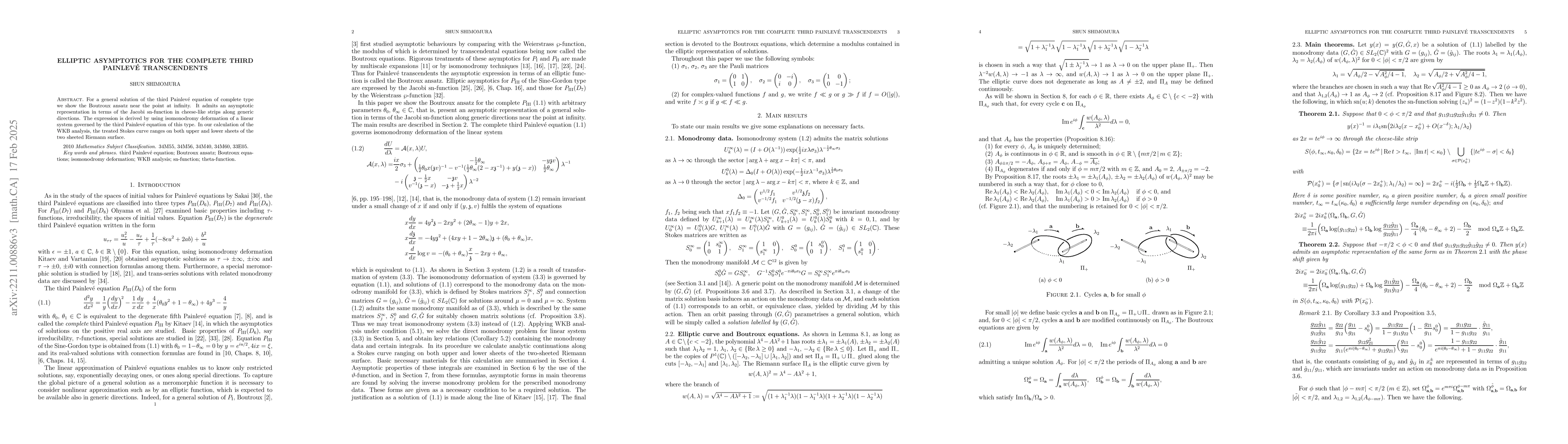 This paper demonstrates the elliptic asymptotics for complete third Painlevé transcendents using the Boutroux ansatz near infinity, showing an asymptotic representation in terms of the Jacobi sn-function. The method employs isomonodromy deformation and WKB analysis to derive the expression, considering Stokes curves on both sheets of the Riemann surface.