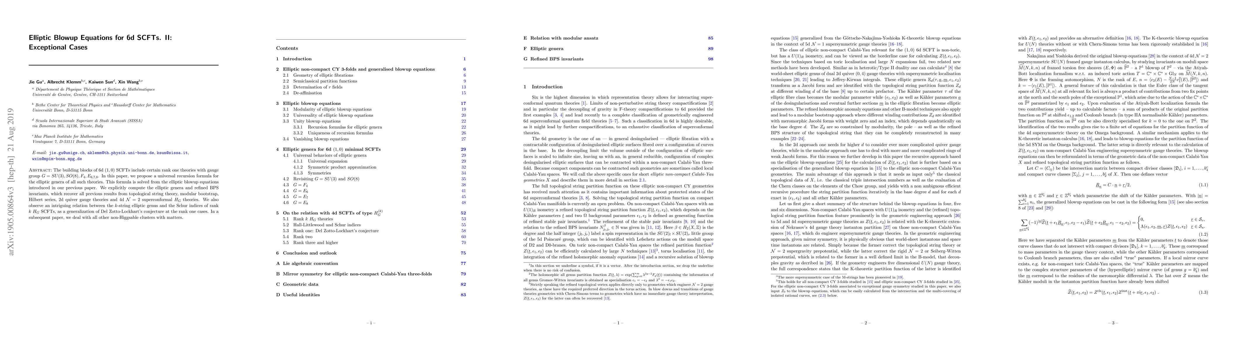 This paper proposes a universal recursion formula for the elliptic genera of exceptional rank one 6d $(1,0)$ SCFTs with gauge groups $G=SU(3),SO(8),F_4,E_{6,7,8}$, deriving it from elliptic blowup equations. It computes these elliptic genera and refined BPS invariants, linking them to various theoretical frameworks and identifying a relation between $k$-string elliptic genus and Schur indices.