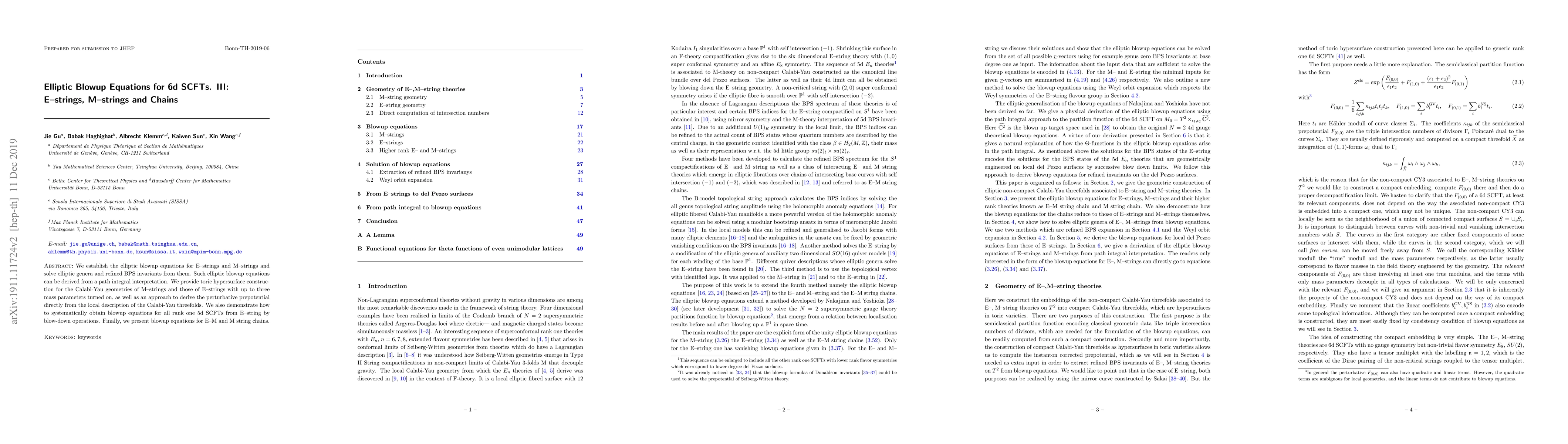 This paper establishes elliptic blowup equations for E-strings and M-strings in 6d SCFTs, deriving their elliptic genera and refined BPS invariants. It provides a toric hypersurface construction for Calabi-Yau geometries and demonstrates a method to obtain perturbative prepotentials from local Calabi-Yau threefold descriptions, while also detailing blowup equations for E-M and M string chains.